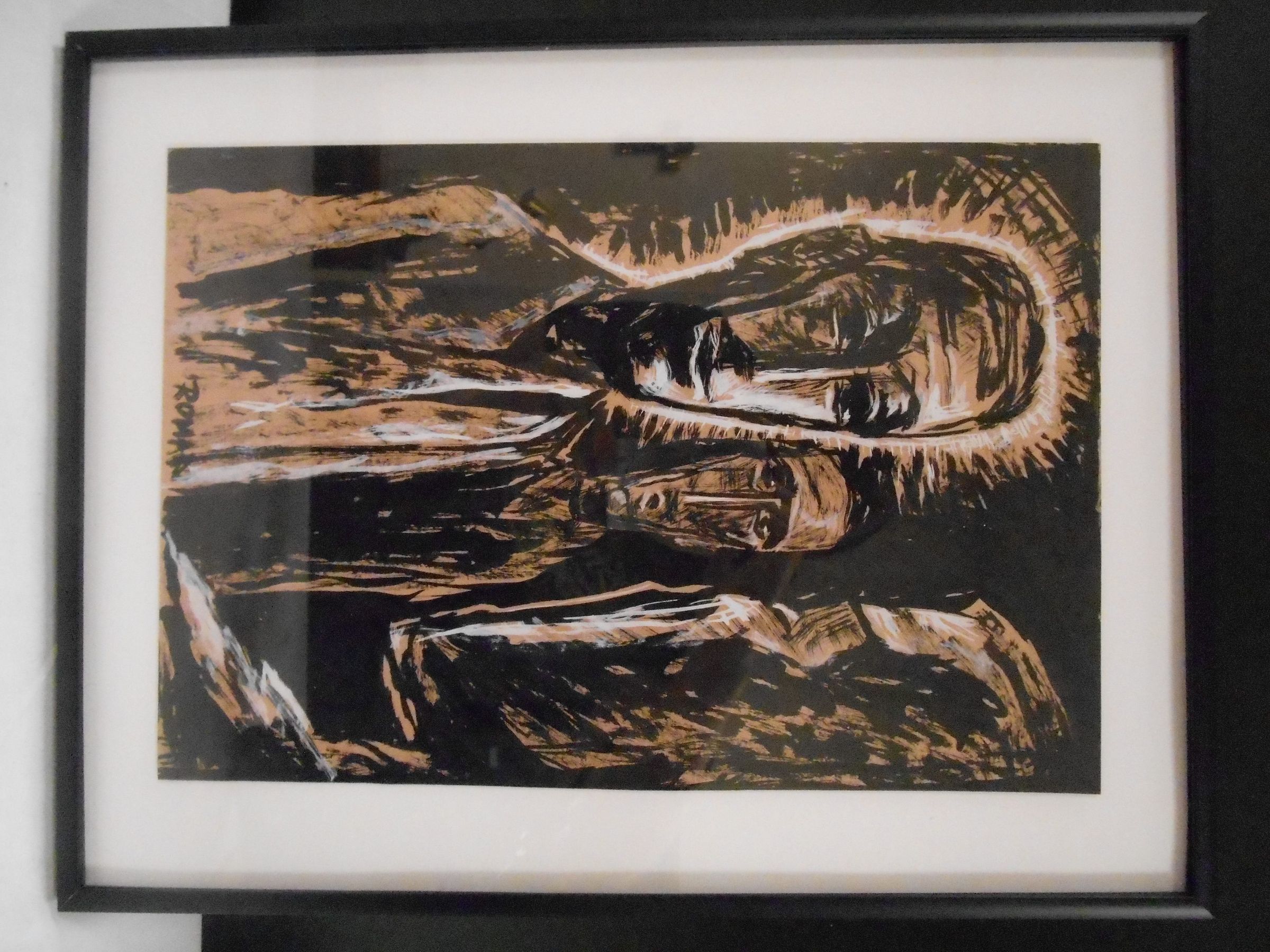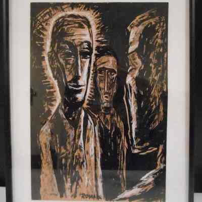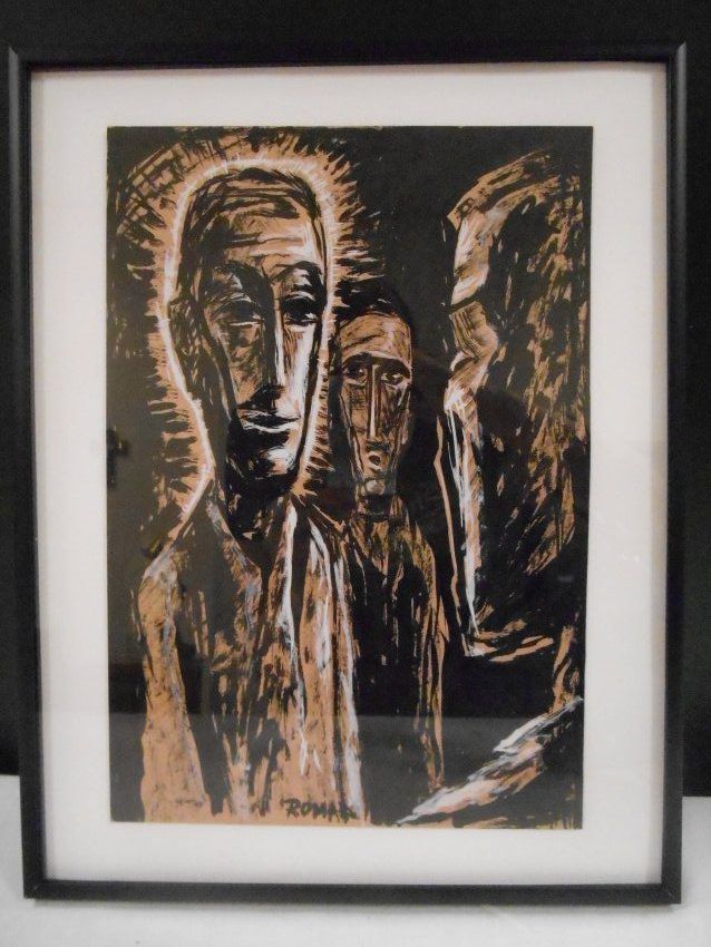 Painting of three men looking at one another. One glows with holiness. The painting of Saint Bernard by Andre Girard in the Saint Vincent Archabbey Basilica Crypt influences some of Roman's early monastic figure drawing. Here he portrays the contemporary person who speaks truth as a Jesus type. The glow of the Jesus type and manner of suggesting a group reflects Girard's approach to imagining tracnscendent moments.Artwork Details