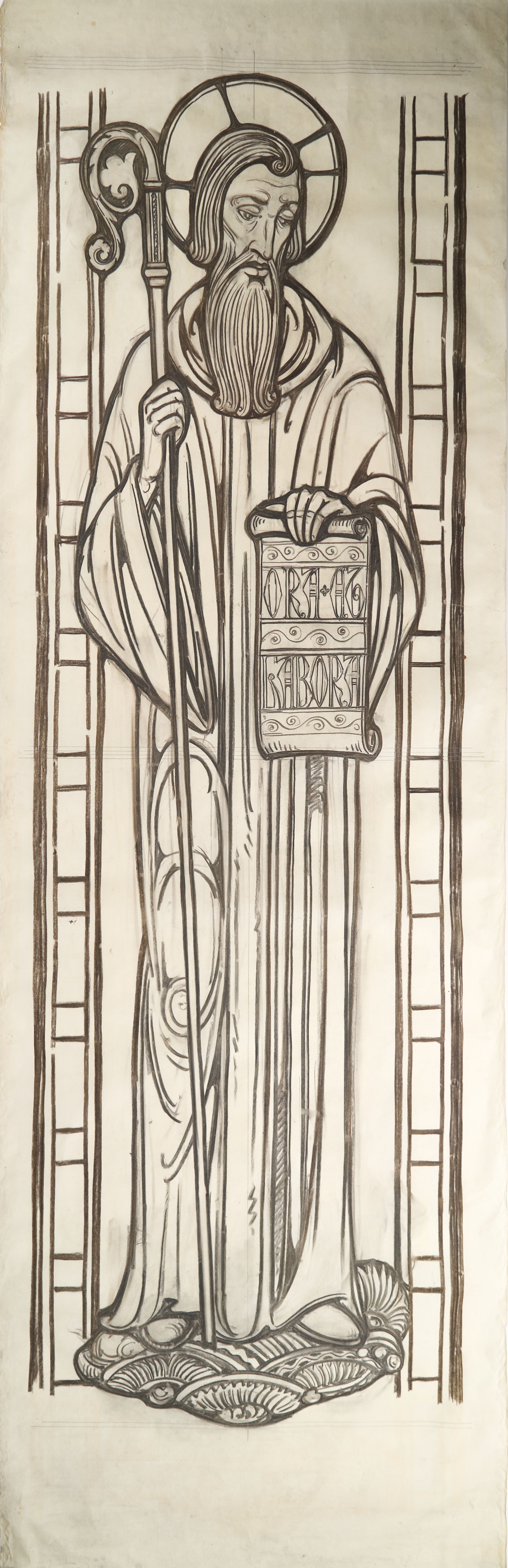 Stained glass scale cartoon, St. Leo the Great Catholic Church, Winston-Salem. NC. Aisle or transept window figure, depicting St. Benedict holding a crozier and a scroll reading "ORA ET LABORA."Type of Drawing