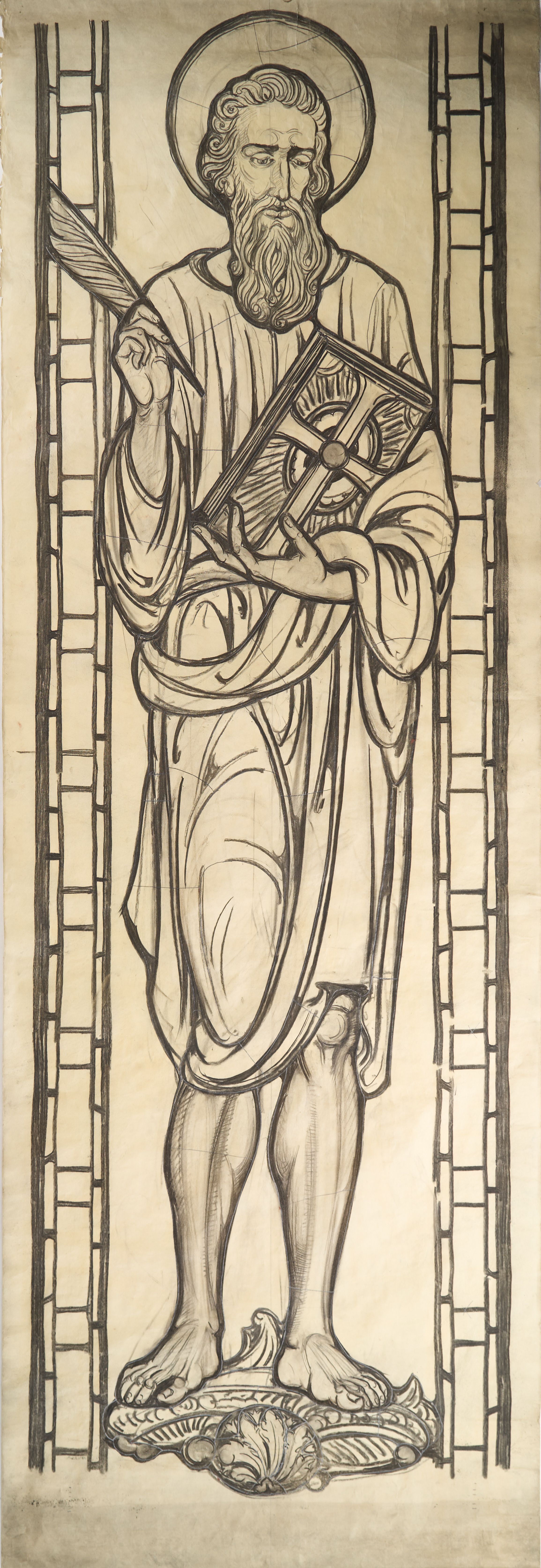 Stained glass scale cartoon, St Leo the Great Catholic Church, Winston-Salem, NC. Aisle or transept window figure, depicting St. Jerome holding a bible and quill.Type of Drawing