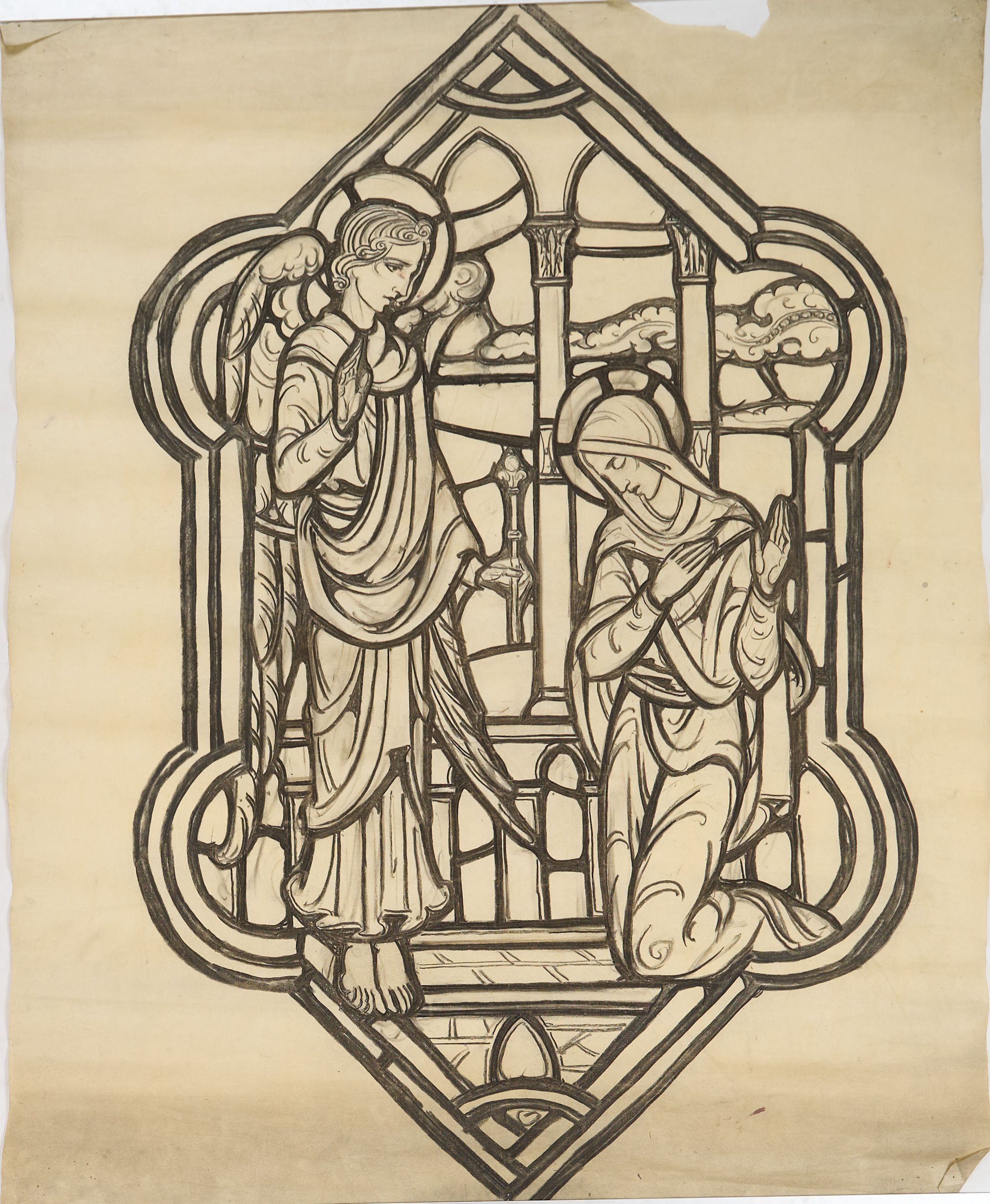 Stained glass scale cartoon; St. Leo the Great Catholic Church, Winston-Salem, NC. Medallion depicting the Annunciation. The Archangel Gabriel is on the left and Mary is on the right.Type of Drawing