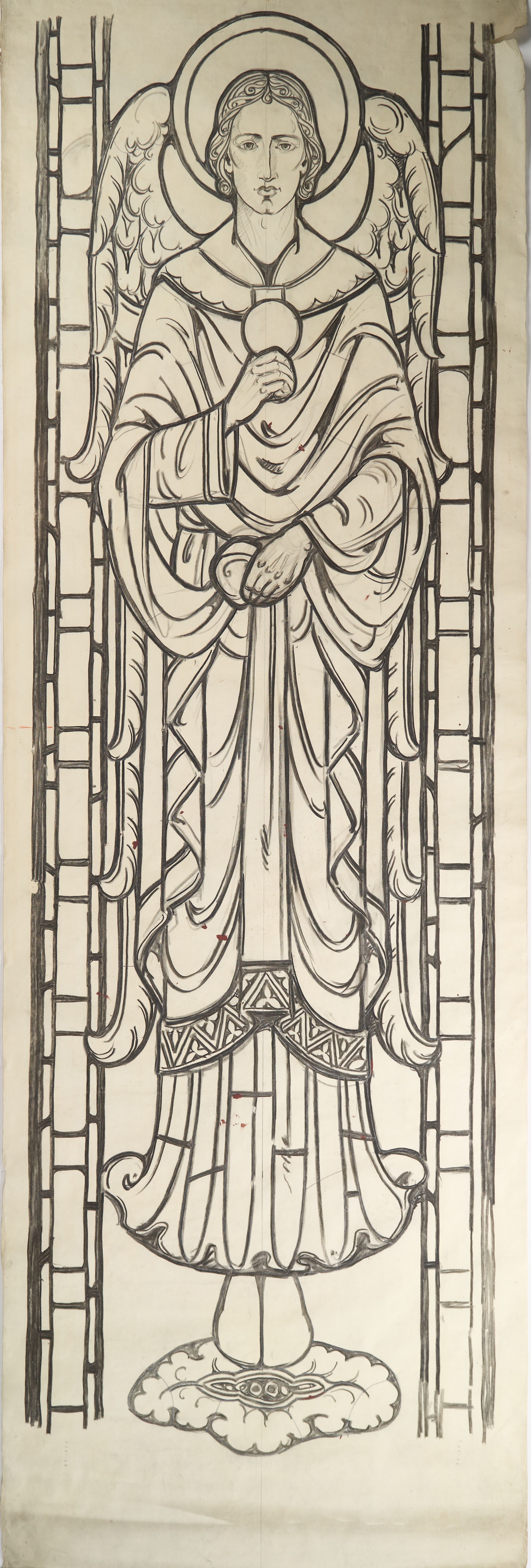 Stained glass scale cartoon, panel of the epistle side altar window at St. Leo the Great Church in Winston-Salem, North Carolina. Depicts St. Michael, angel of the Holy Eucharist, holding the Host.