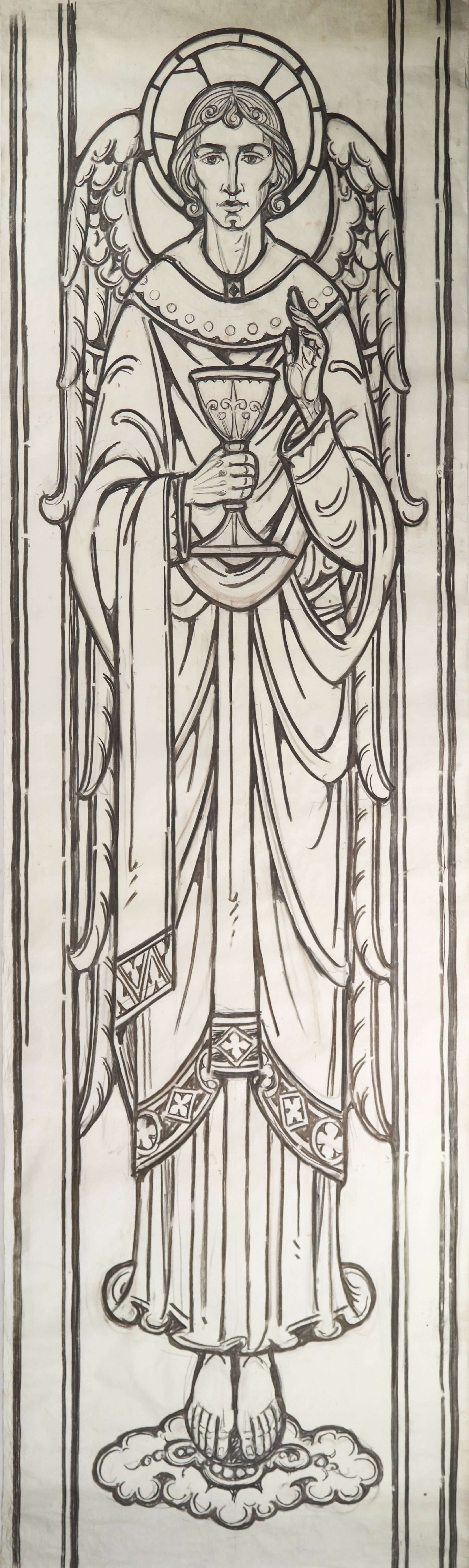 Stained glass scale cartoon, panel of the gospel side altar window at St. Leo the Great Church in Winston-Salem, North Carolina. Depicts St. Uriel the Archangel holding a chalice.