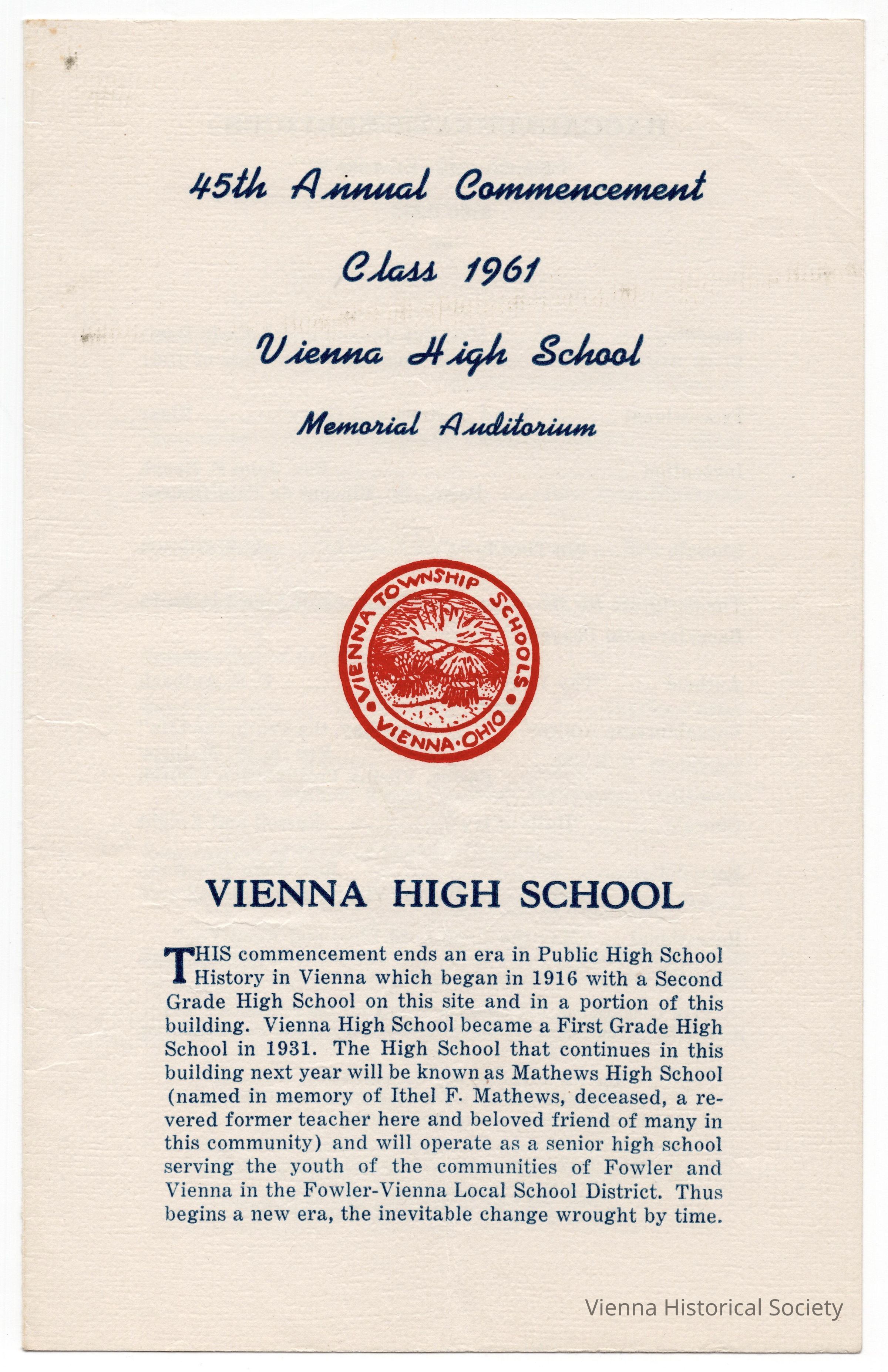 Vienna High School Commencement Program, 1961Collection