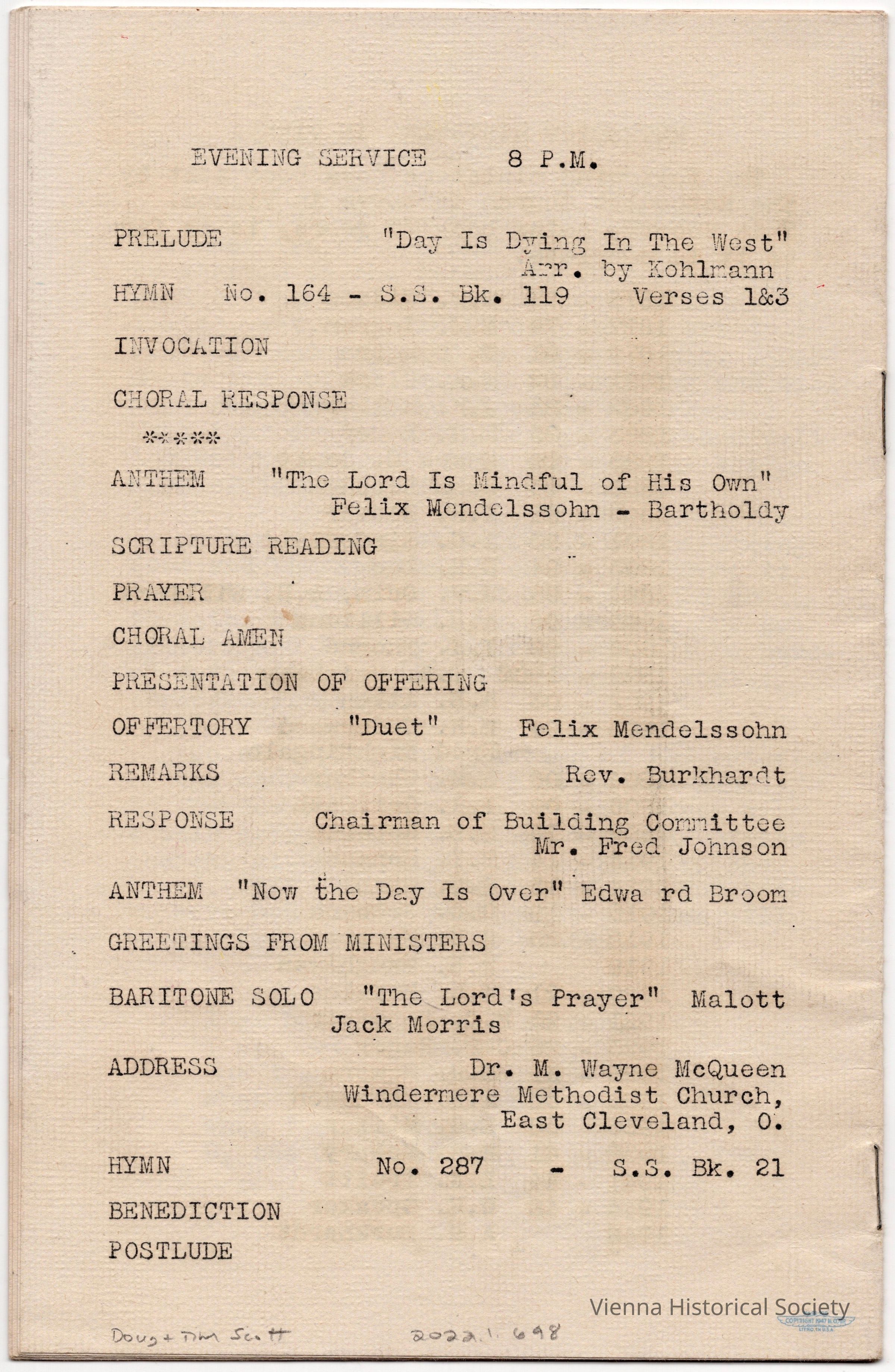 Vienna Methodist Church Remodeling Dedication Pamphlet, July 17, 1949Collection