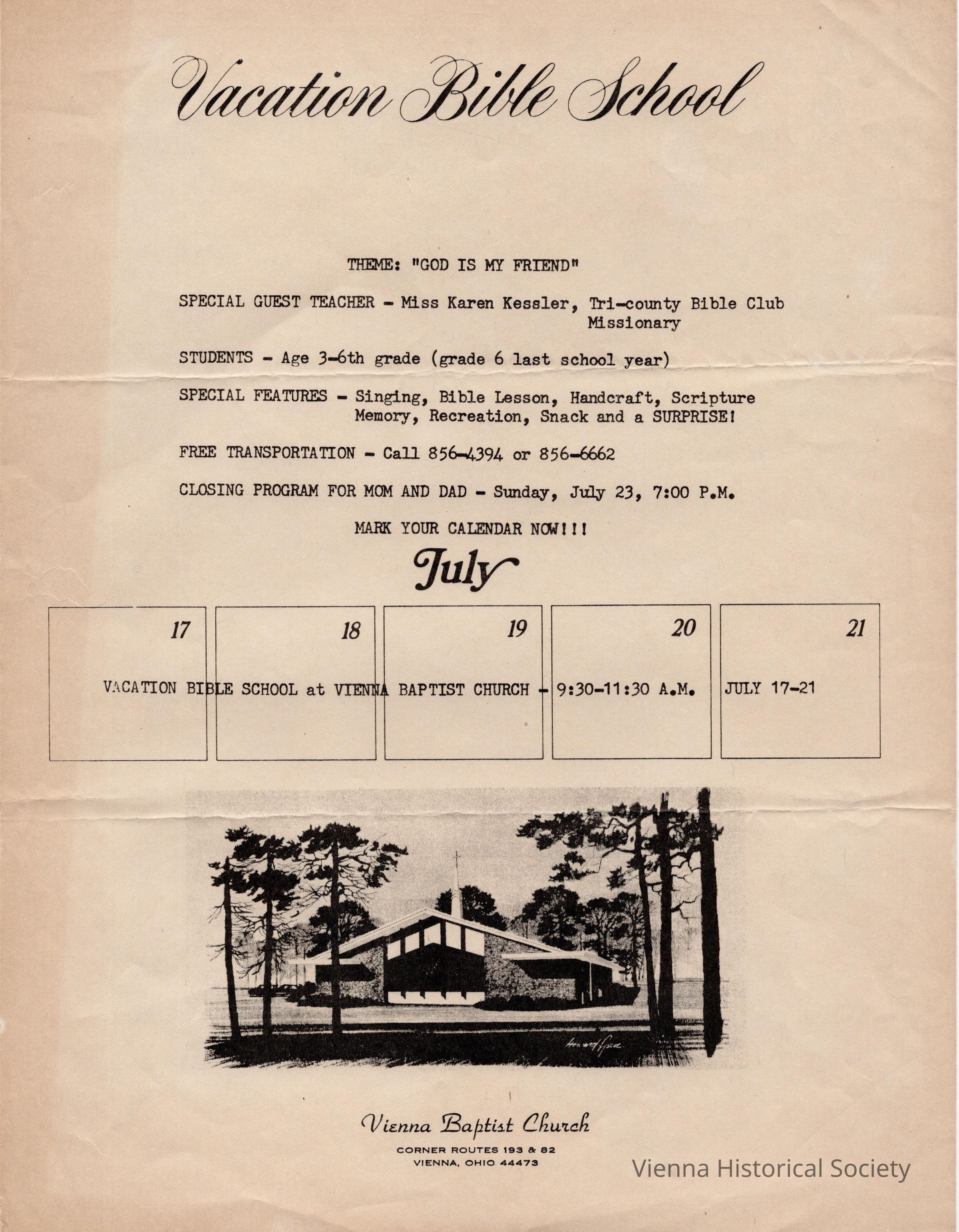 Vienna Baptist Church Vacation Bible School Flyer, date unknownCollection