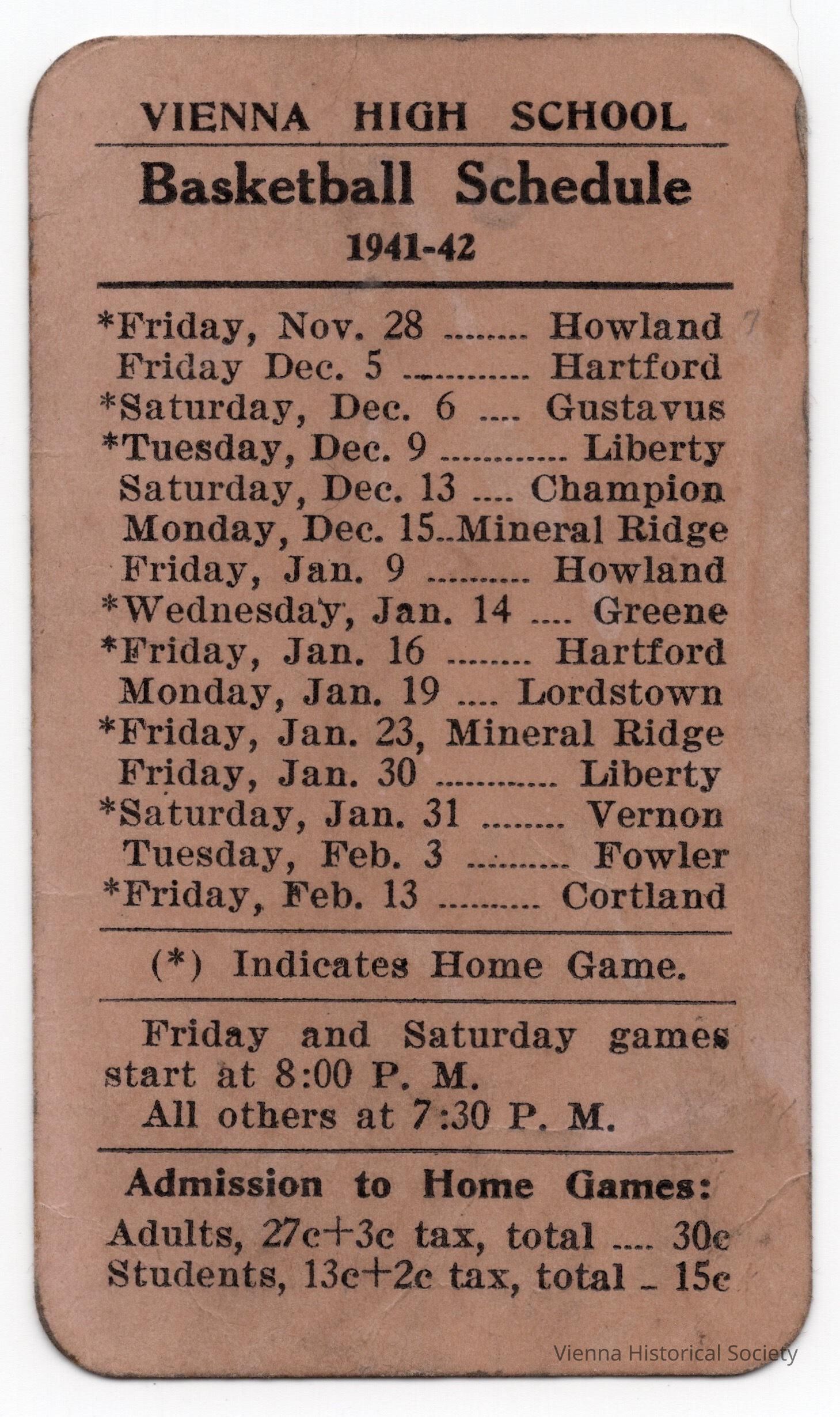 Vienna High School Basketball Schedule, 1941-1942 school yearCollection