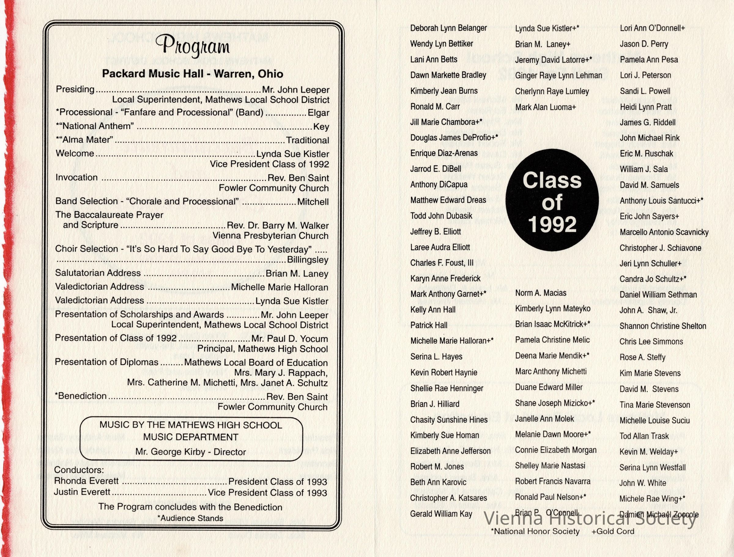 Mathews High School Commencement Program, 1992Collection