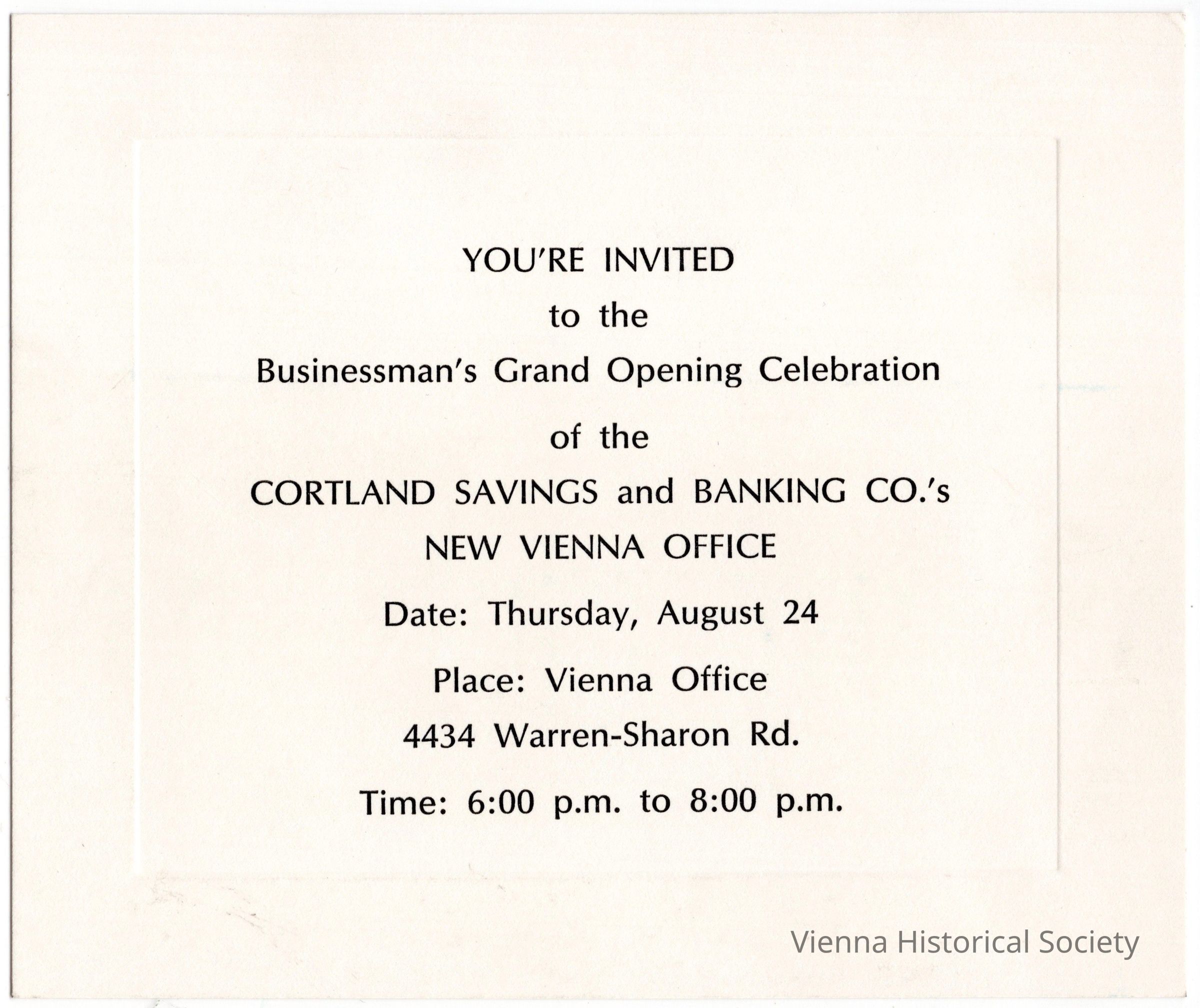 Cortland Banks - Vienna Branch Grand Opening Invitation, 1972Collection