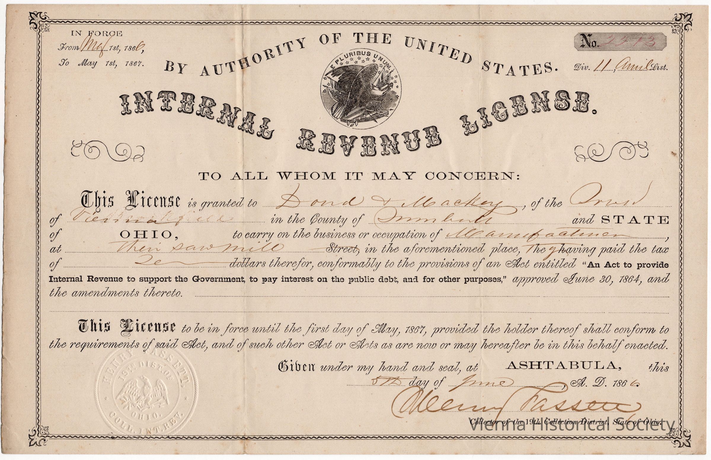 Doud & Ira B. Mackey Vienna Saw Mill Tax Receipt, June 5, 1866Collection
