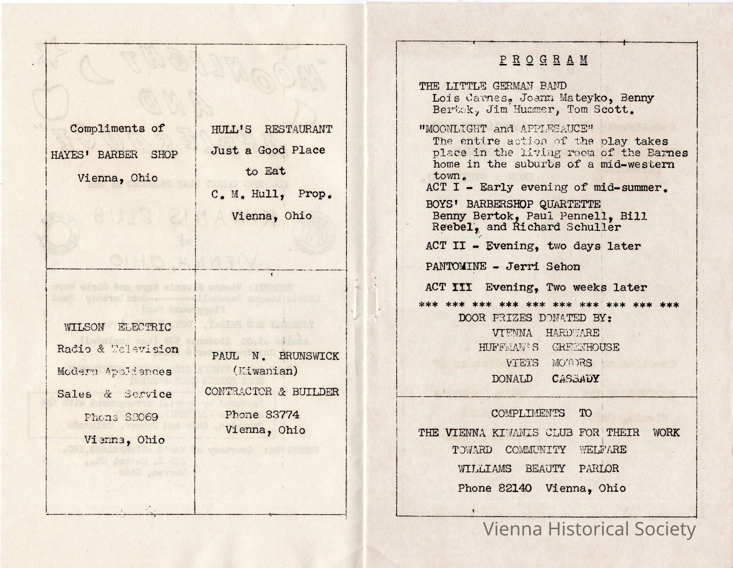 Vienna Kiwanis Club Play Program, Moonlight and Applesauce, October 7th & 8th, 1954Collection