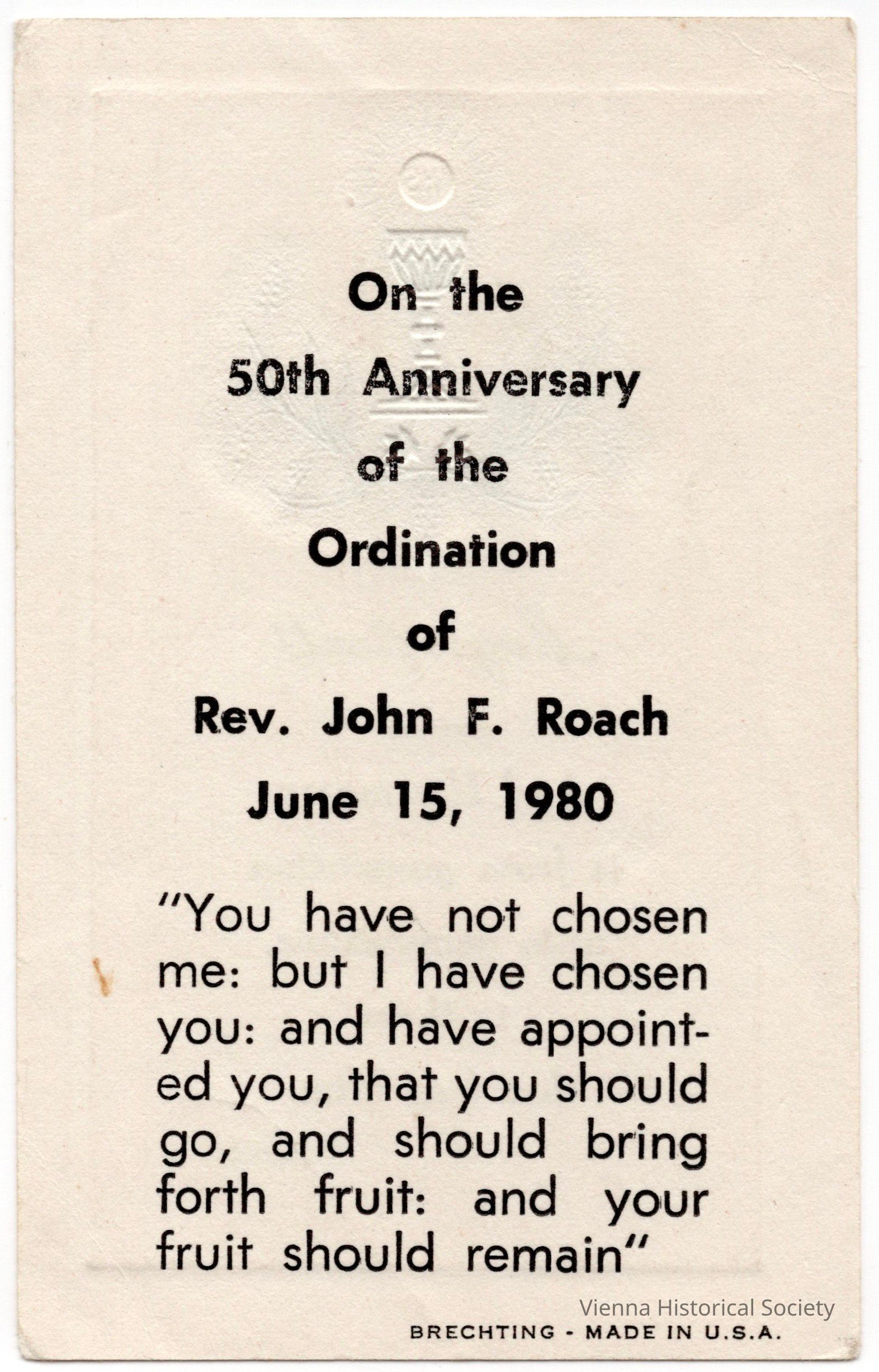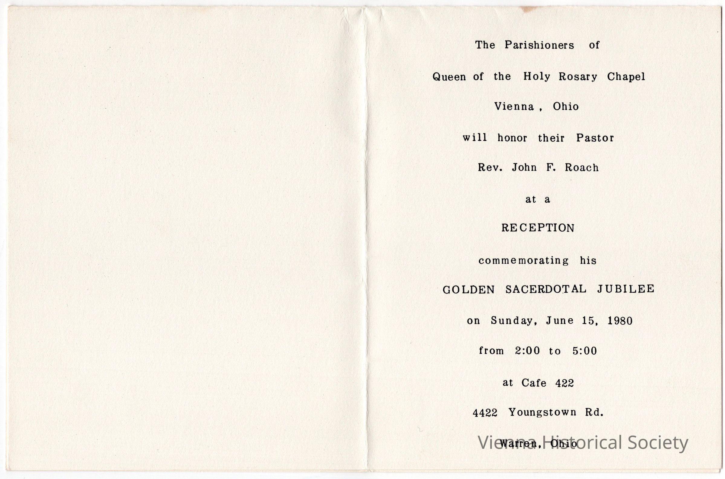 Queen of the Holy Rosary Chapel, Fr. John Roach Golden Sacerdotal Jubilee Celebration Invitation, June 15, 1980Collection
