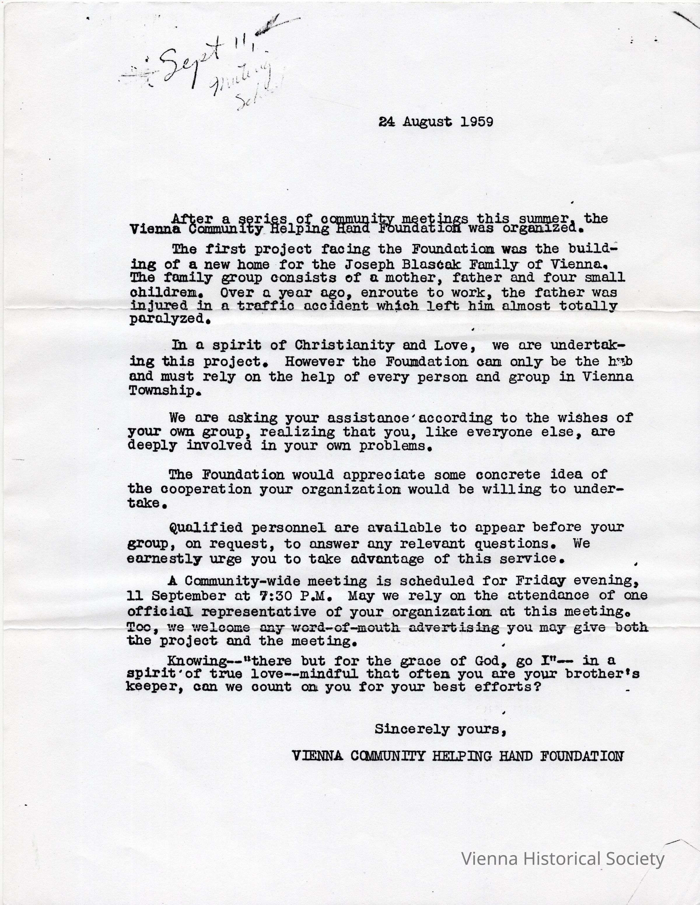 Vienna Community Helping Hands Foundation Letter, August 24, 1959Collection