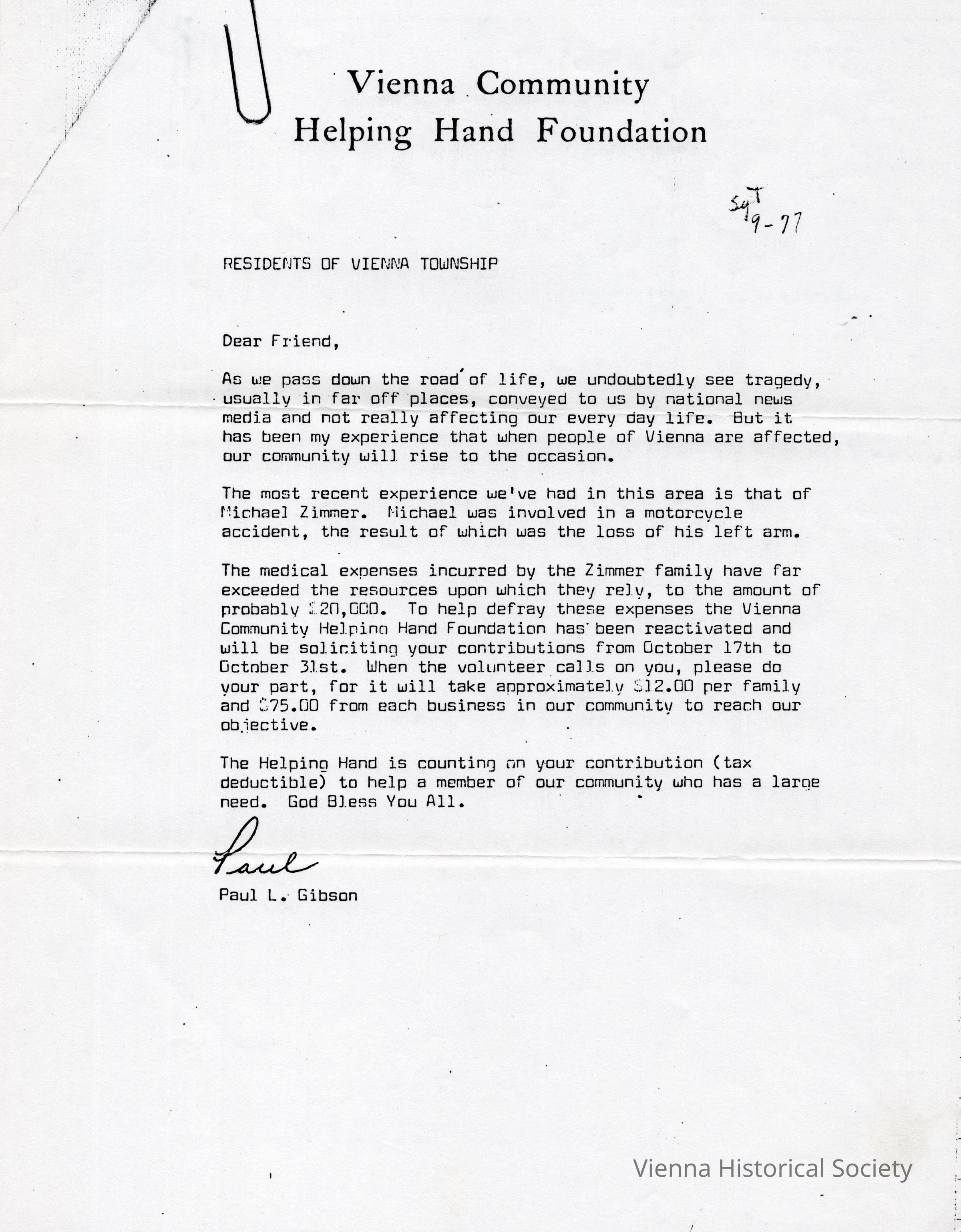 Vienna Community Helping Hands Foundation Letter, 1977Collection