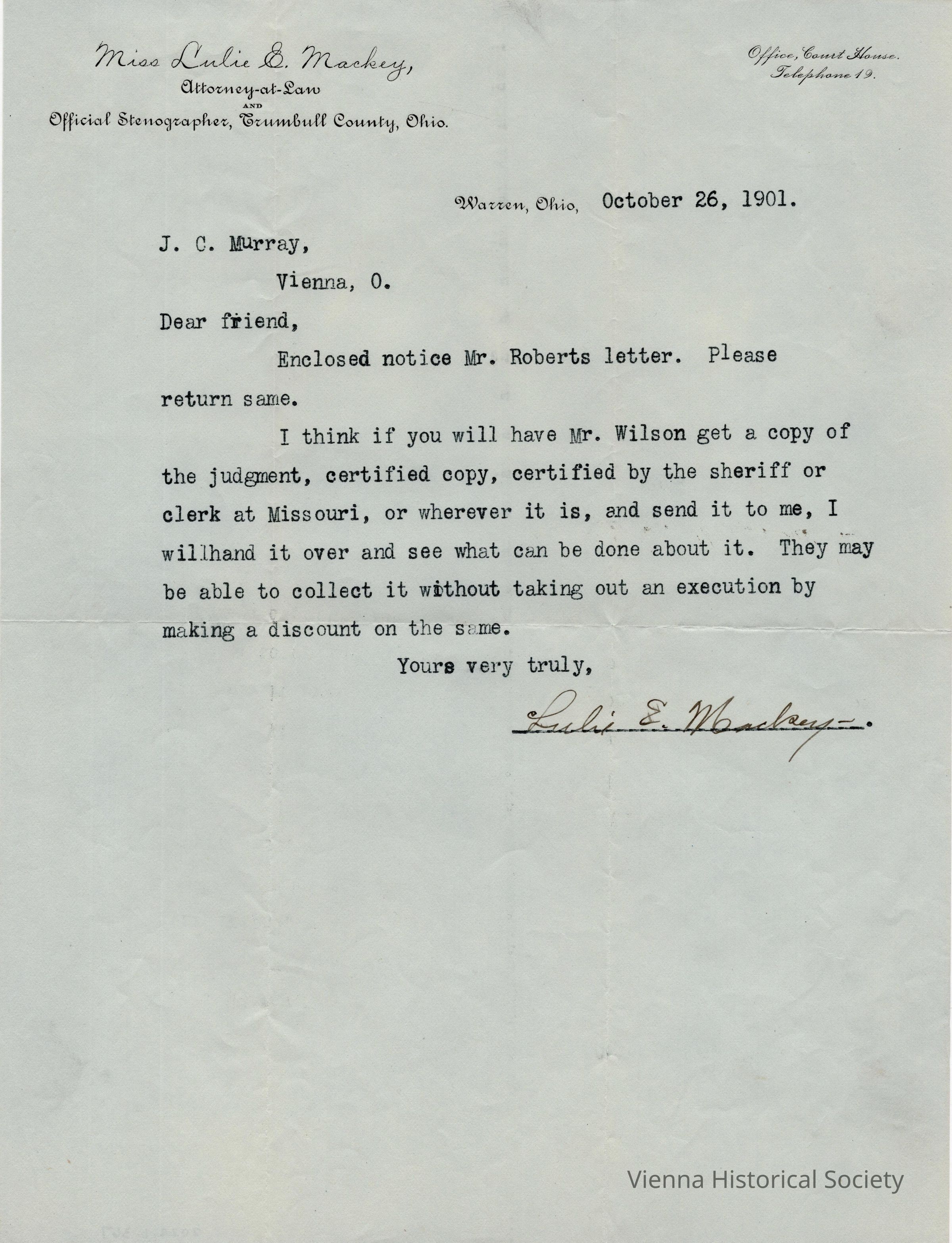 Letter to Jeremiah C. Murray from Lulie E. Mackey, October 26, 1901Collection