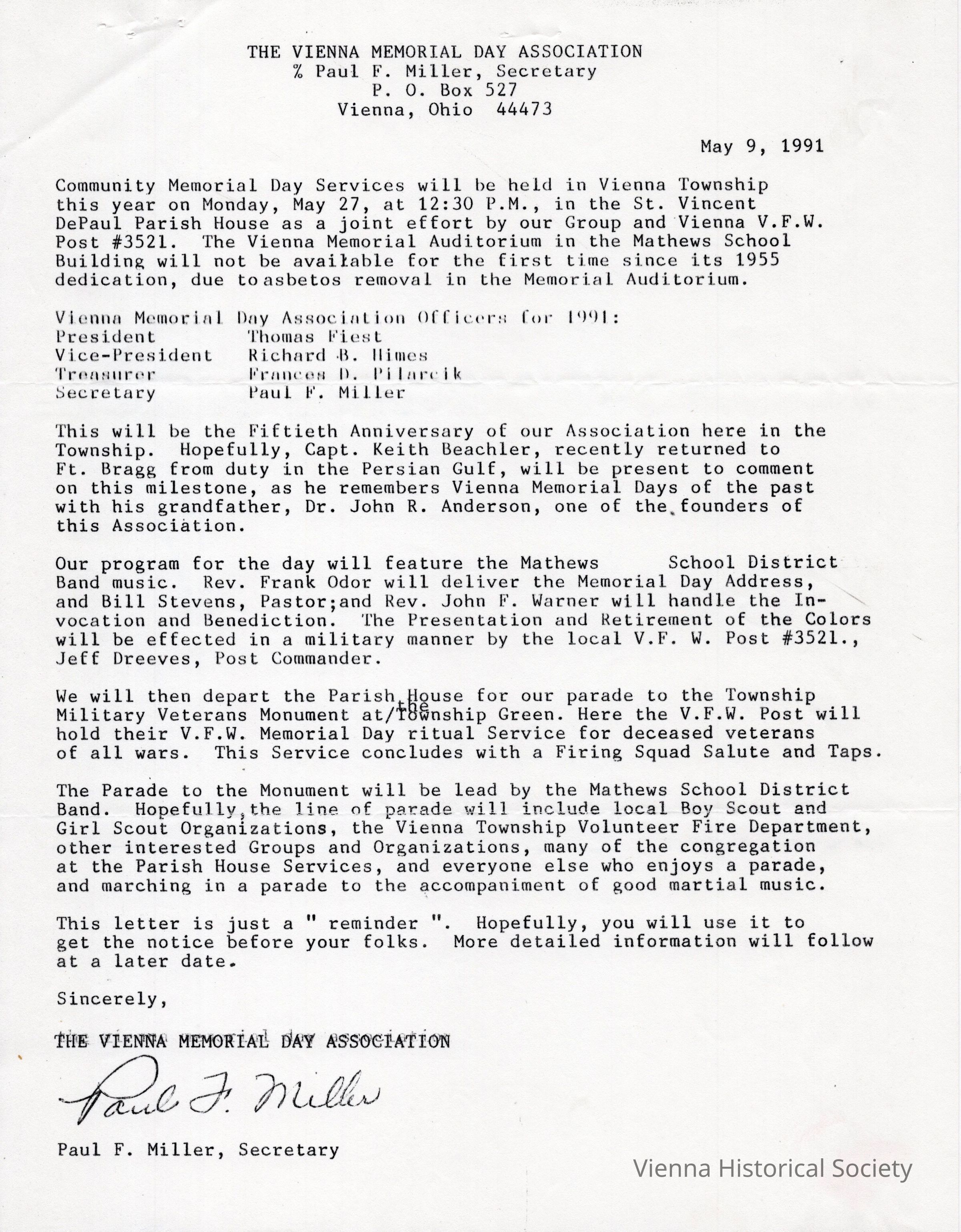 Vienna Township Memorial Day Association Flyer, May 9, 1991Collection