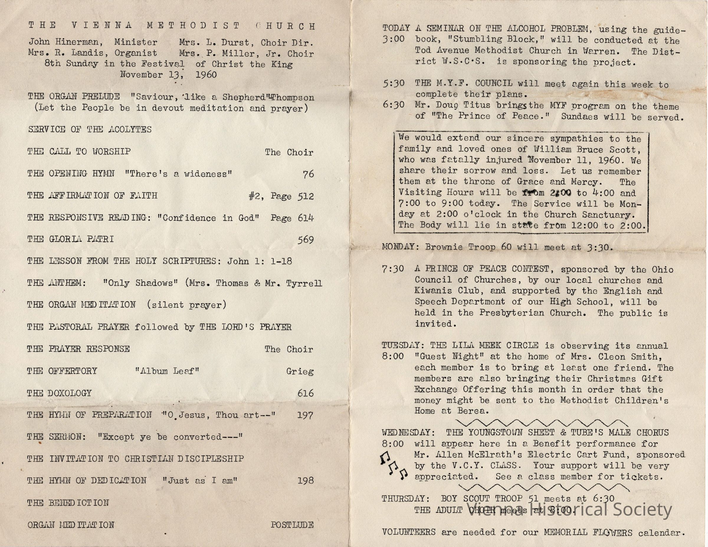 Vienna Methodist Church Bulletin, November 13, 1960Collection