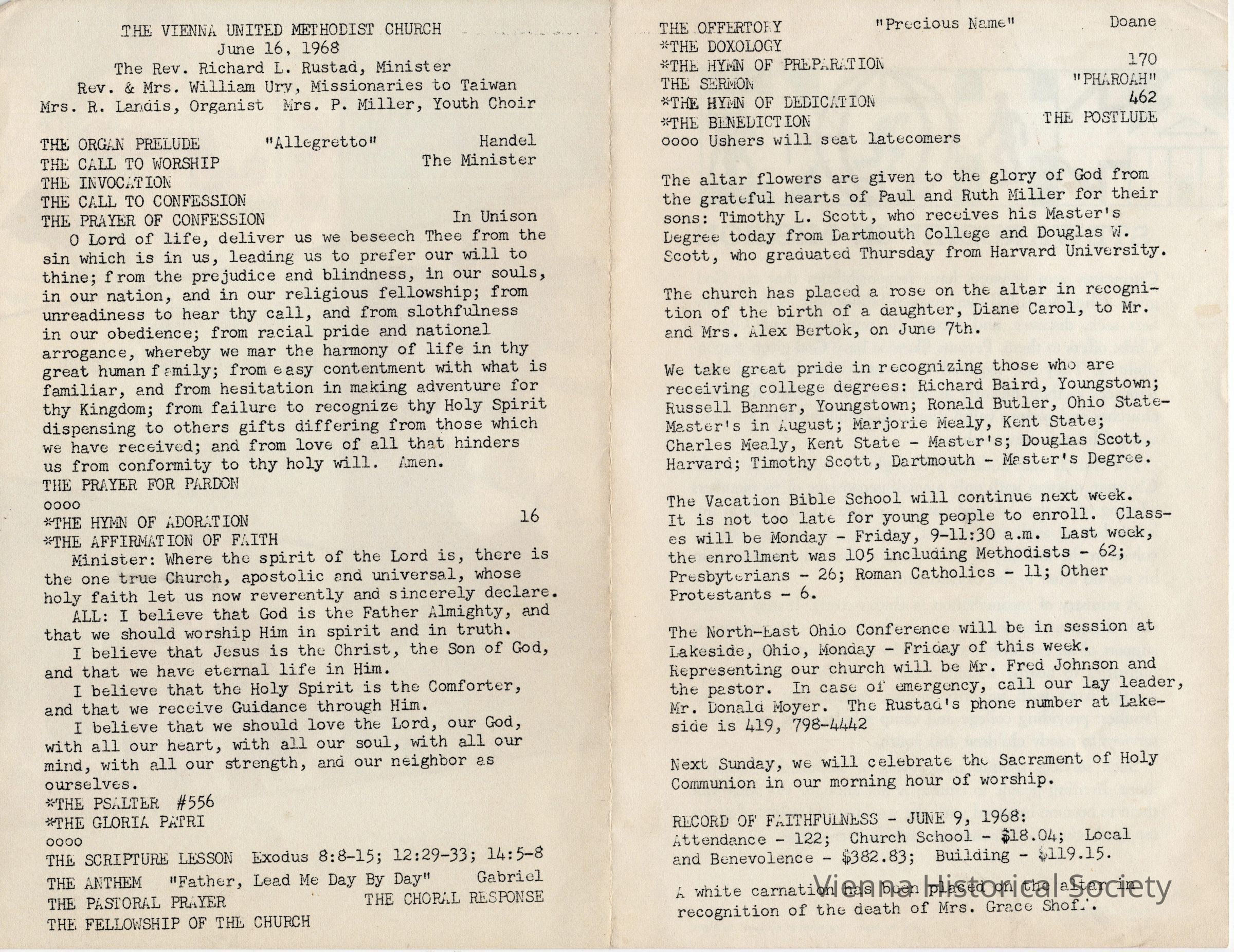 Vienna Methodist Church Bulletin, Junen 16, 1968Collection