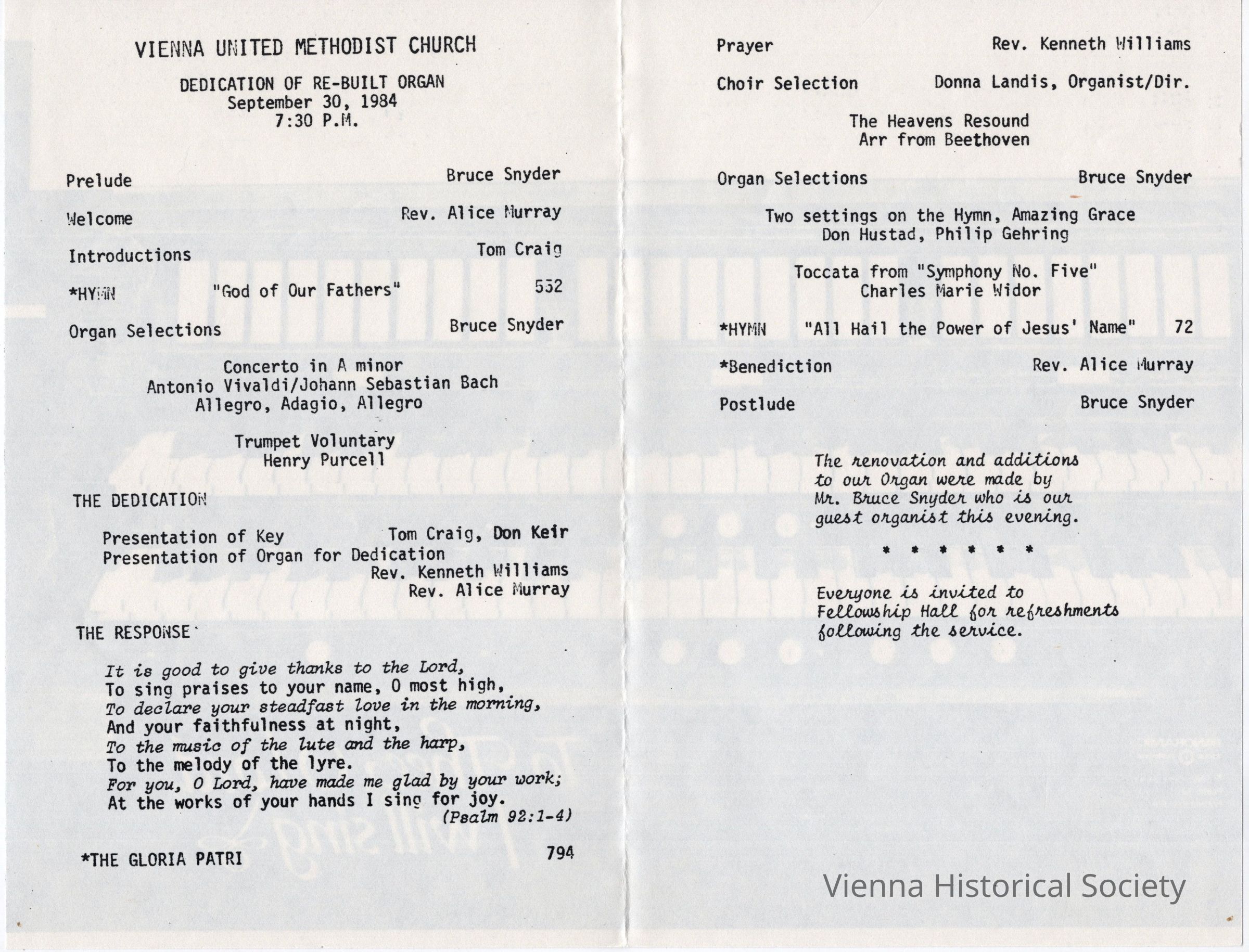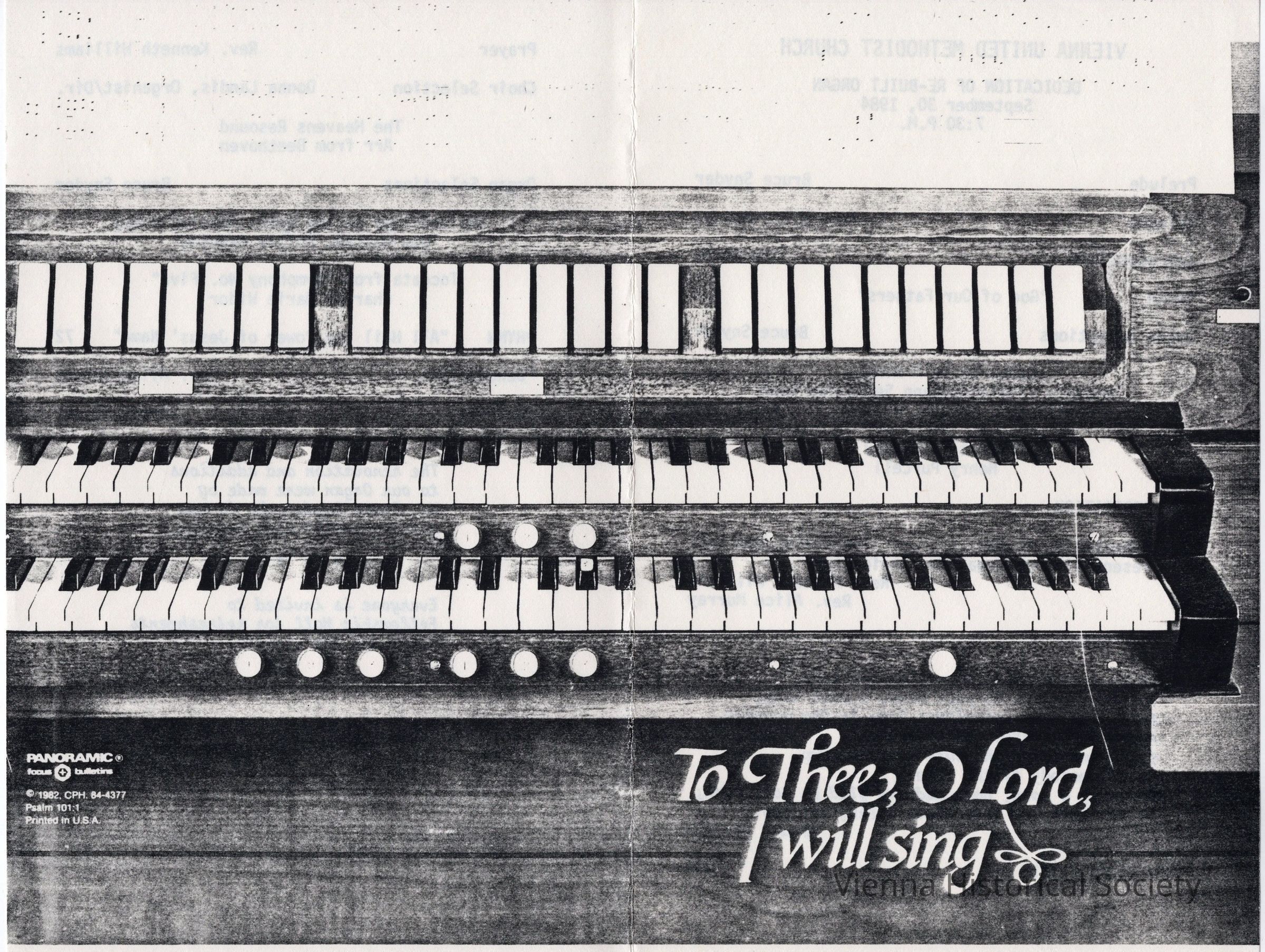 Vienna Methodist Church Bulletin, September 30, 1984, Dedication of Rebuilt OrganCollection