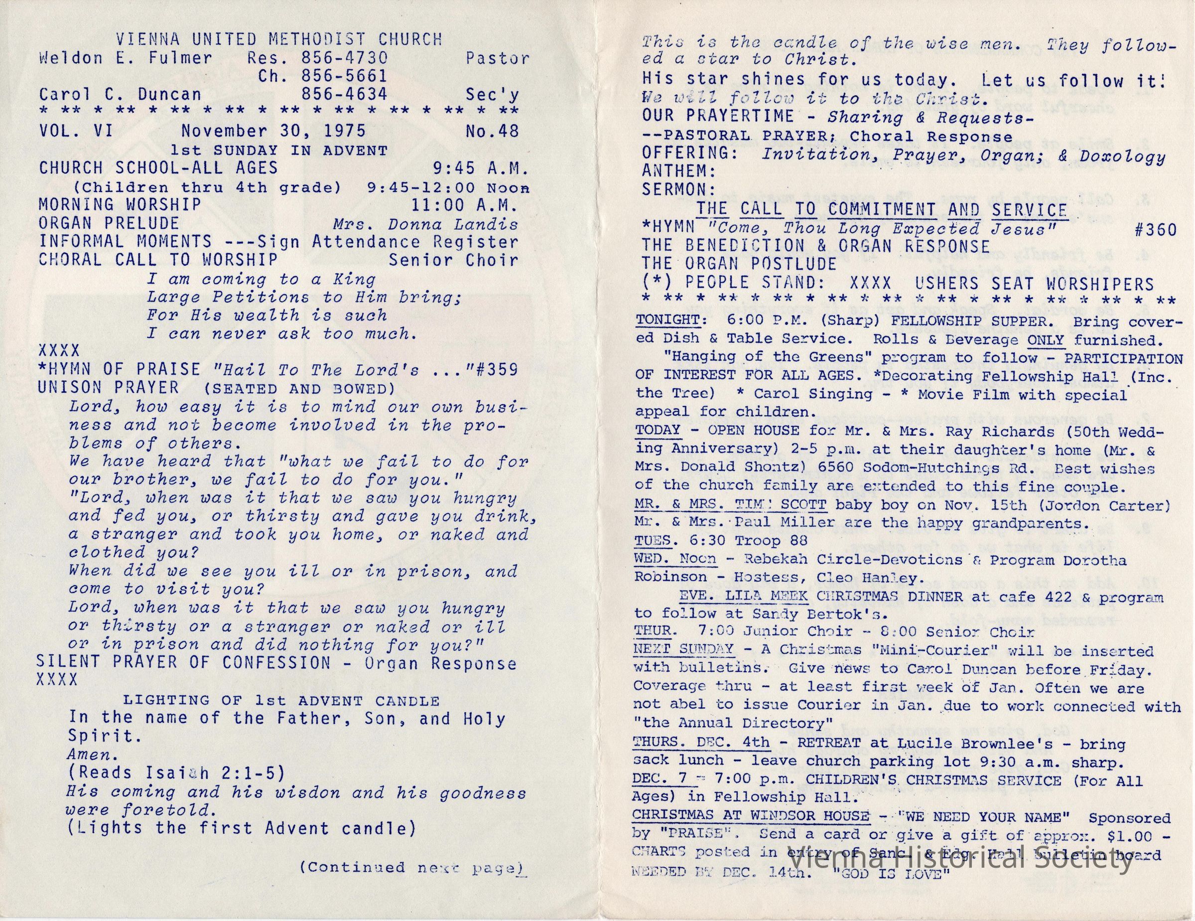 Vienna Methodist Church Bulletin, November 30, 1975Collection