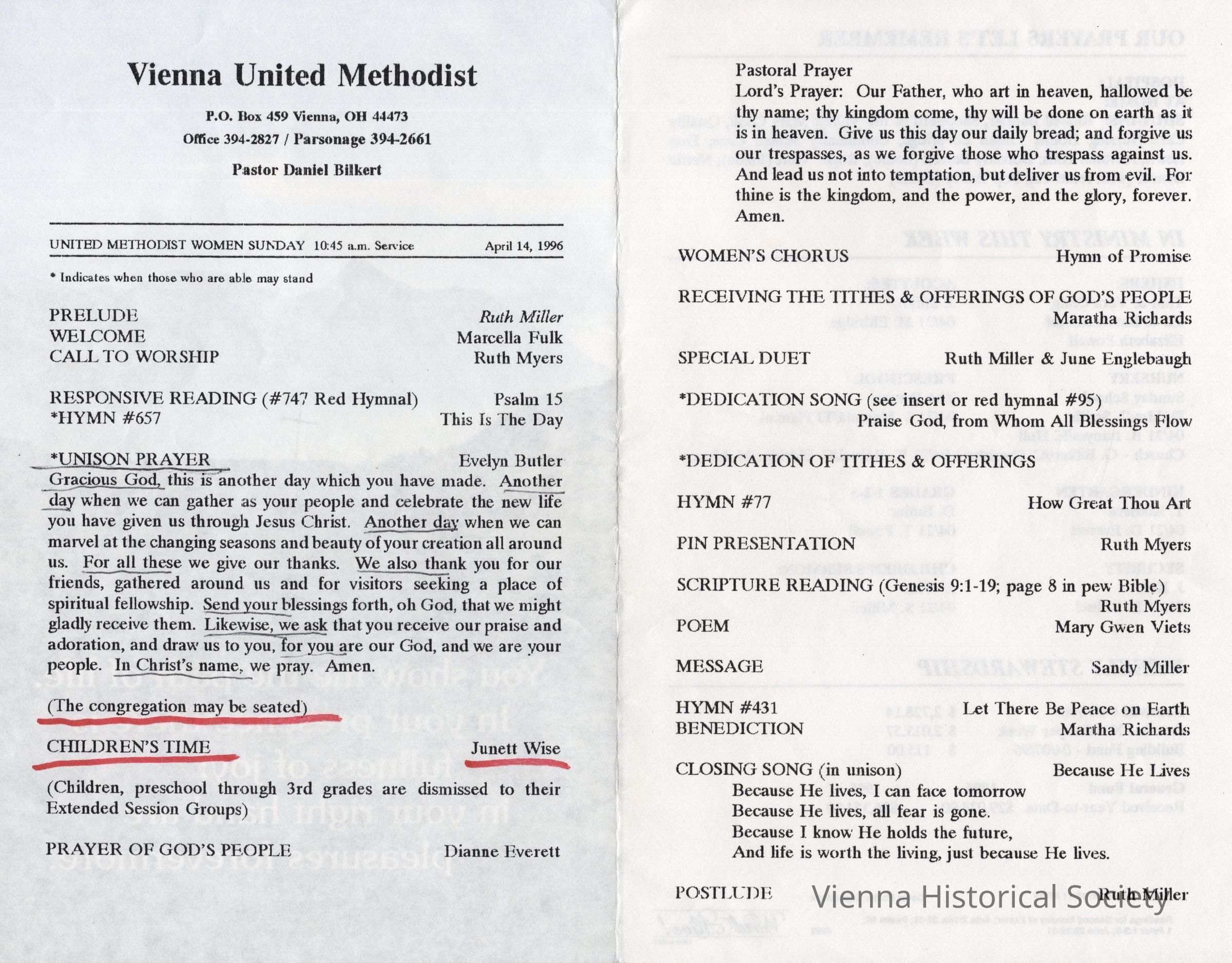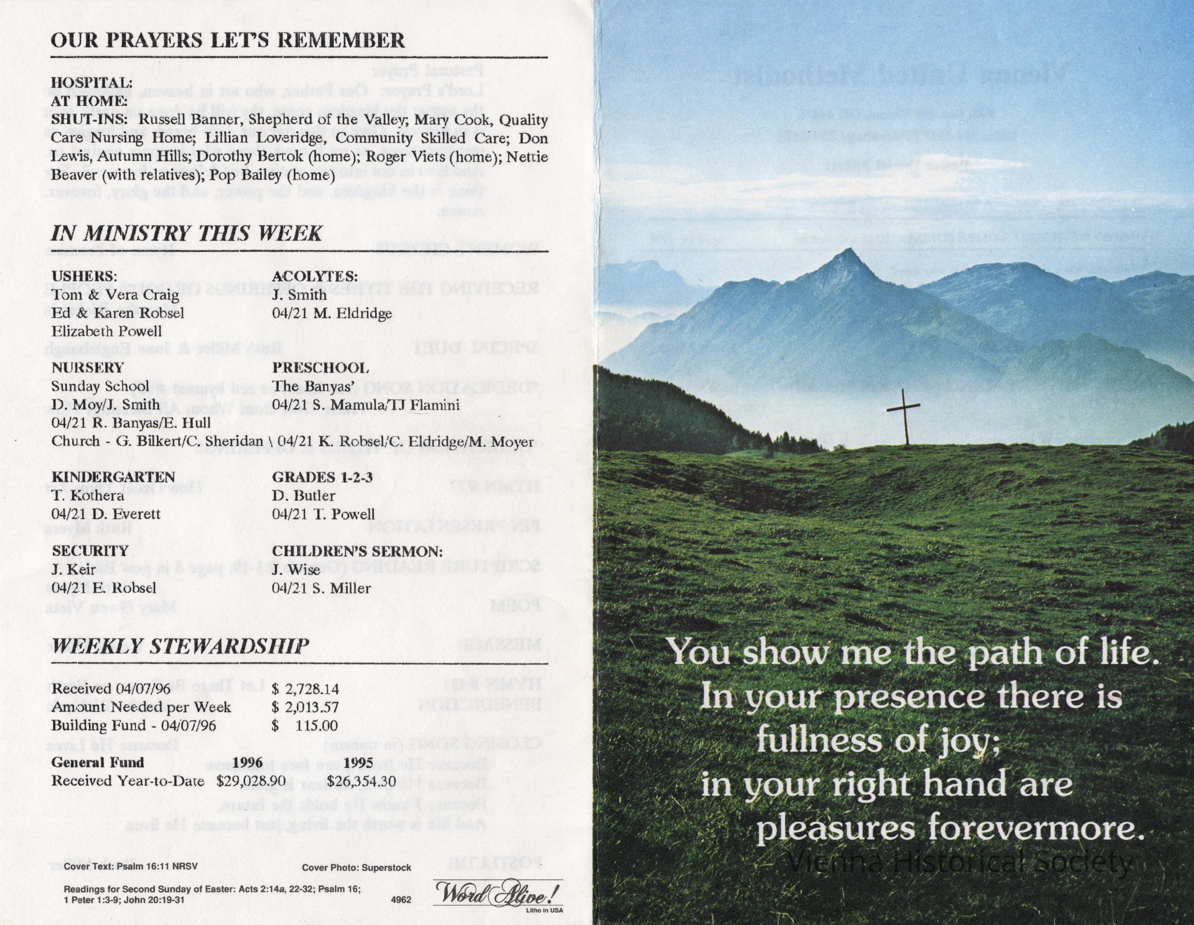 Vienna Methodist Church Bulletin, April 14, 1996Collection