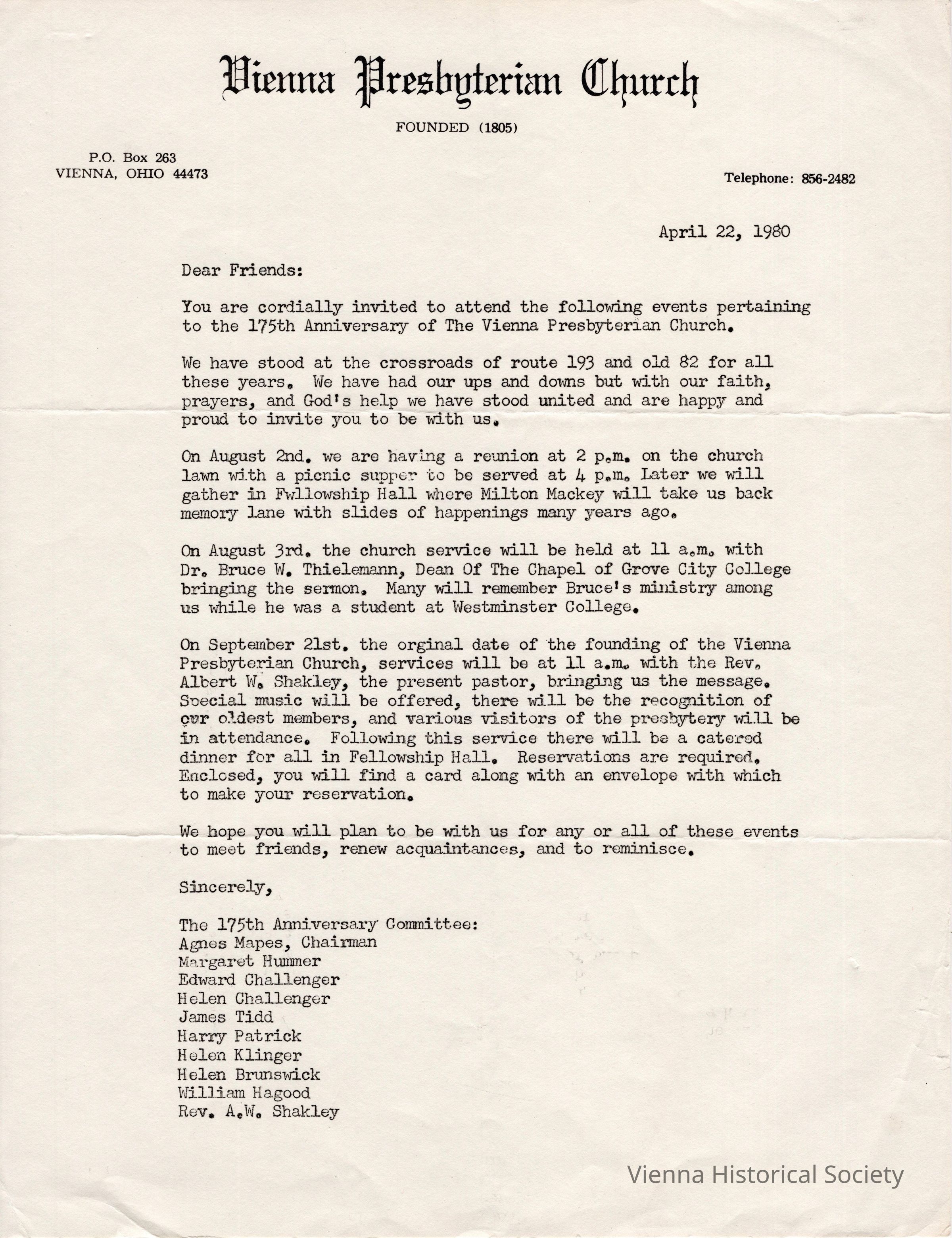 Vienna Presbyterian Church 175th Anniversary Invitation, April 22, 1980Collection