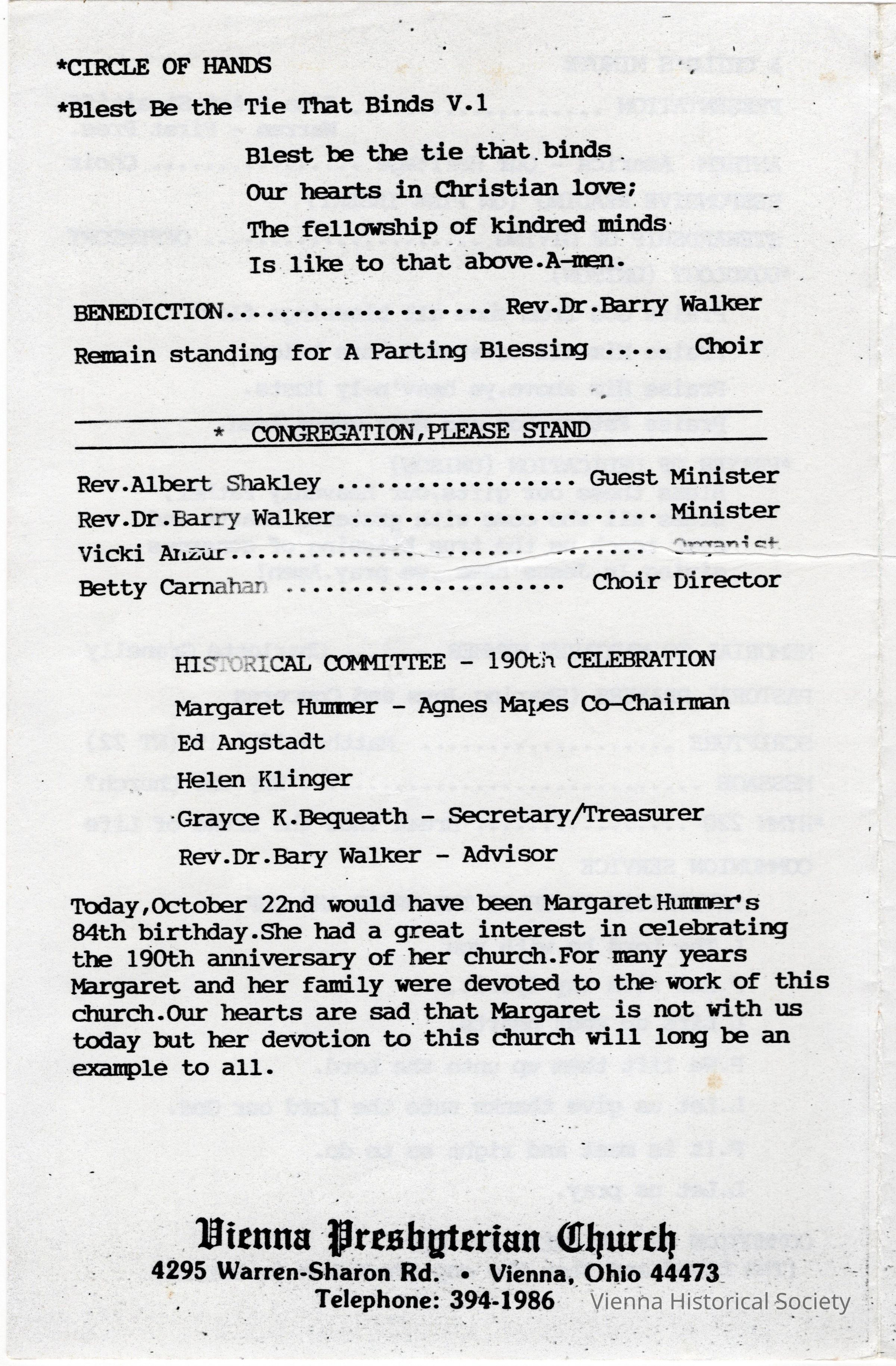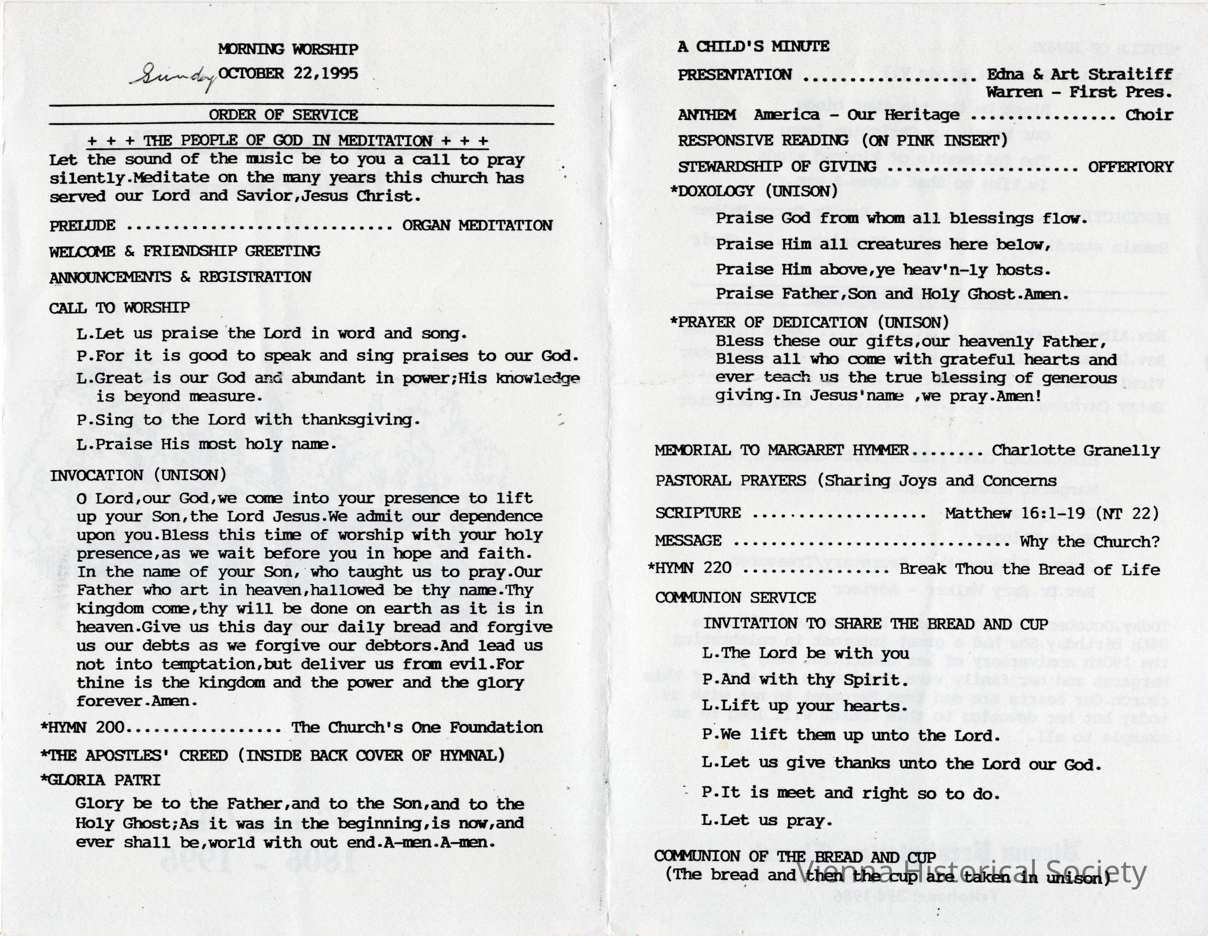 Vienna Presbyterian Church 190th Anniversary Program, October 22, 1995Collection