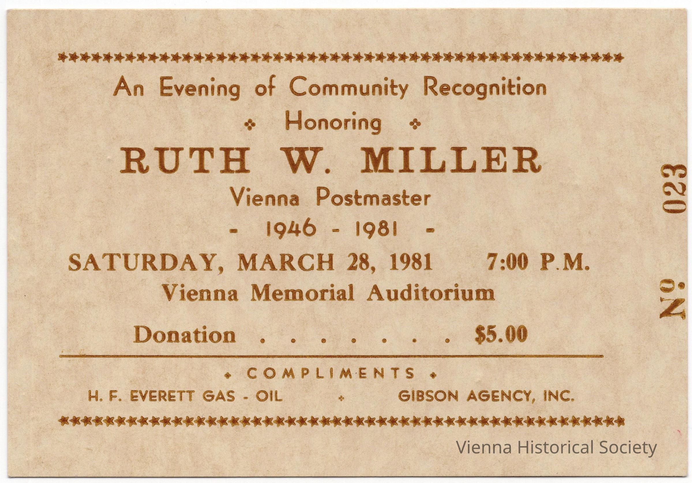 "An Evening of Community Recognition Honouring Ruth W. Miller Vienna Postmaster" Ticket, March 28, 1981Collection