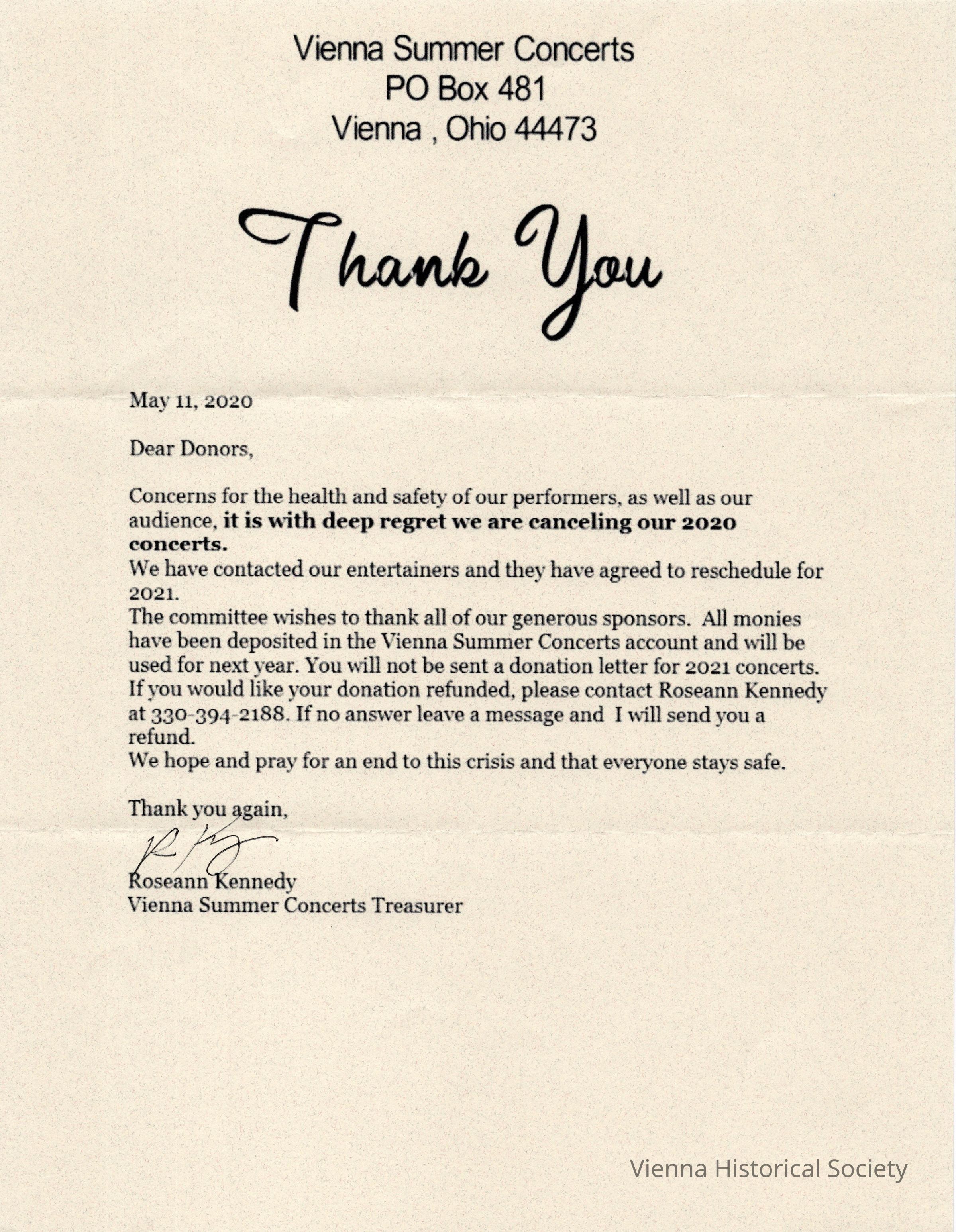 Vienna Summer Concerts Cancellation Letter, May 11, 2020Collection