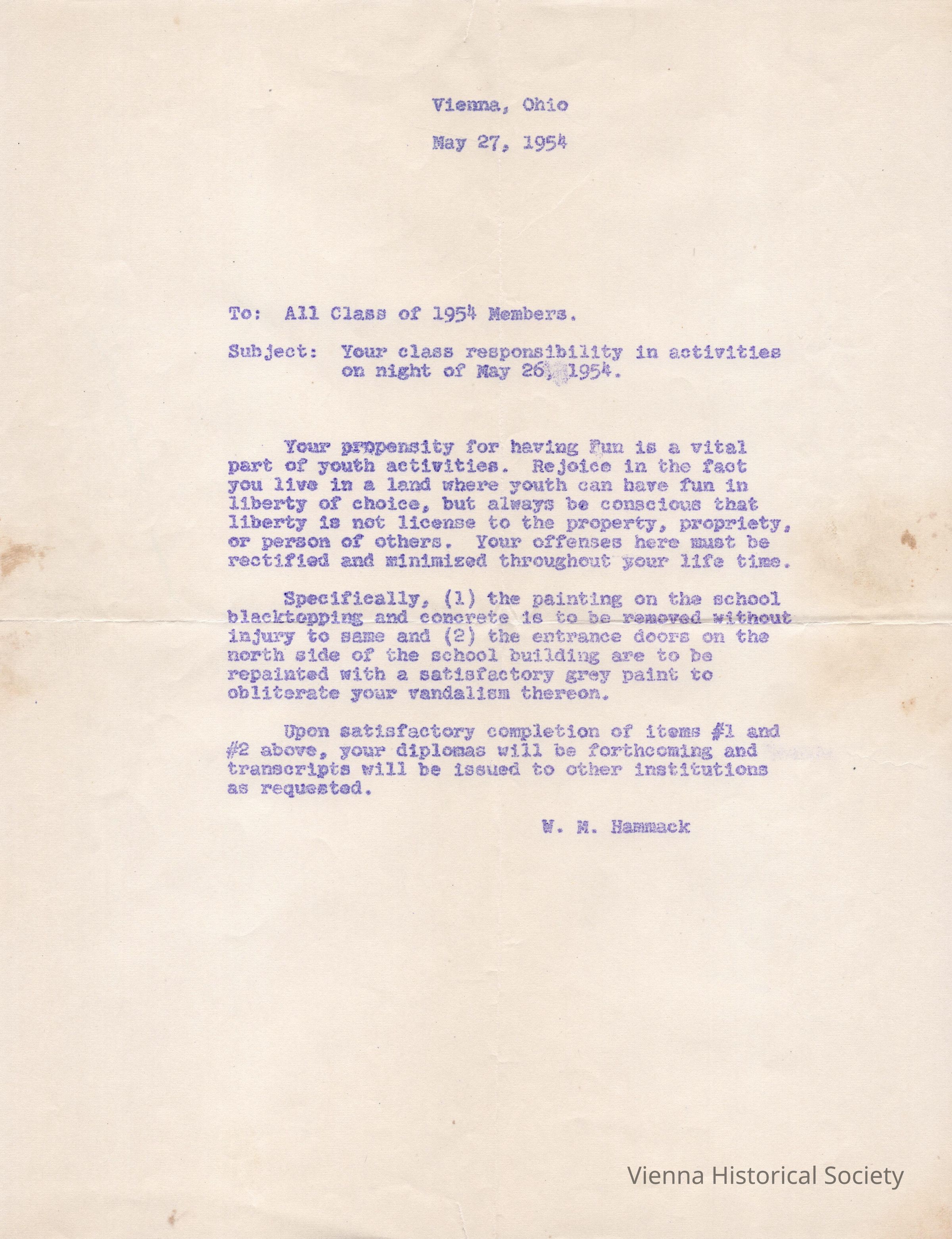 Superintendent Wilbert Merle Hammack Letter to the Vienna High School Class of 1954Collection