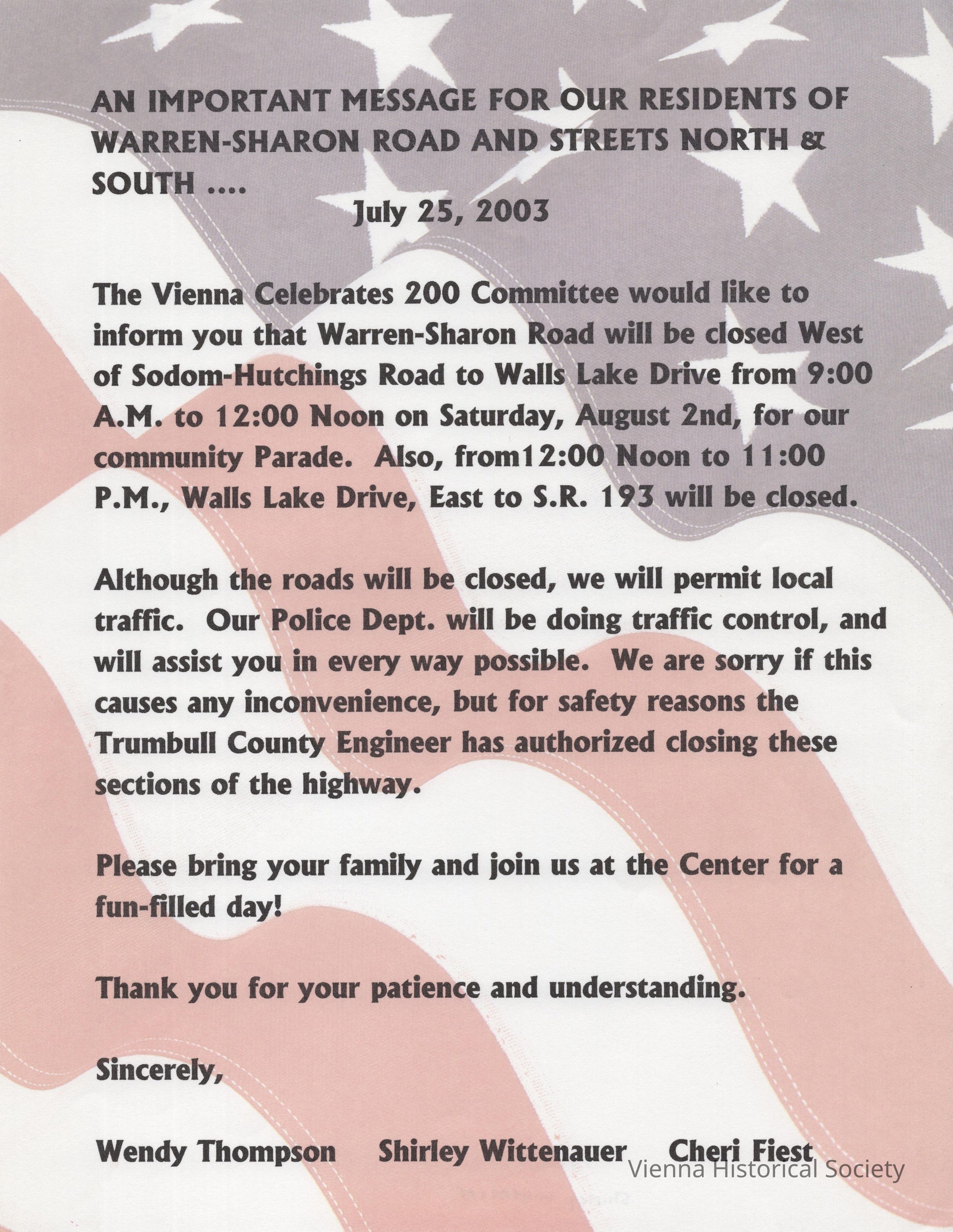 Vienna Celebrates Ohio 200 Street Closure Announcement, July 25, 2003Collection