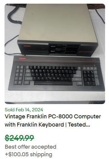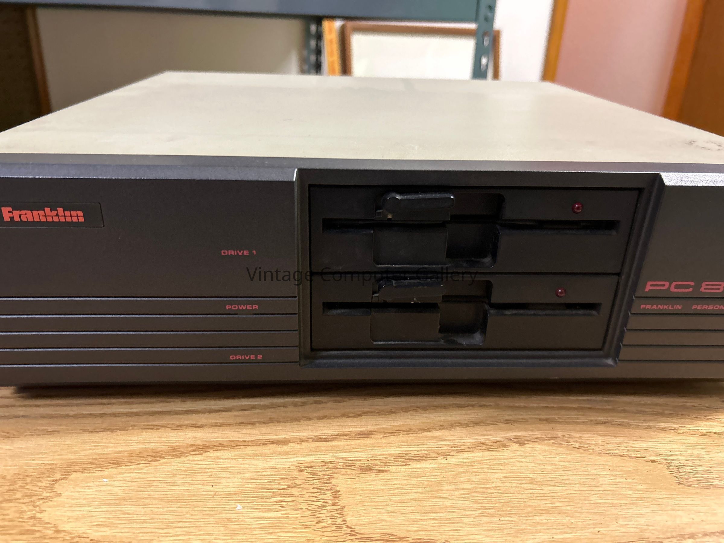 1986- Before Apple forced Franklin out of the desktop computer market entirely, the company released three PC compatible systems, the PC-5000 (picture), PC-6000 and PC-8000. Both were quite similar, based on the Intel 8088. Depending on the versions, they had 512 to 640 KB of RAM, one or two 360 KB floppy drives, standard serial and parallel ports, but also built-in game port, composite video and audio outputs. With the loss of its desktop computer business, Franklin concentrated on its handheld line, which was introduced in 1986. In the years since, Franklin has sold handheld computers that acted as personal organizers, word processors and dictionaries.