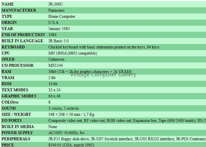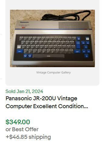 This computer is the same as the Matsushita JR-200U. Two years in the making, the Panasonic JR-200 computer was officially announced in January of 1983, with additional launch dates provided for the computer and peripherals. The JR-200u received early and strong support from two software publishing companies; Data-Most and Walt Disney Telecommunications. Having the support of both of these companies, especially Data-Most, was crucial in Panasonic's strategy to successfully market this computer, as well as it's plans to have 30 software titles available by the official launch in the spring of 1983. Additionally, Panasonic planned for an additional 24 titles to become available by mid-summer of 1983 by consulting with other software developers. From the start, the Panasonic JR-200u was never meant to be a cartridge based machine. Panasonic had other plans for a cartridge based system which never materialized. Initially, software was to be developed first on cassette tapes, and later floppy disks.Acquisition