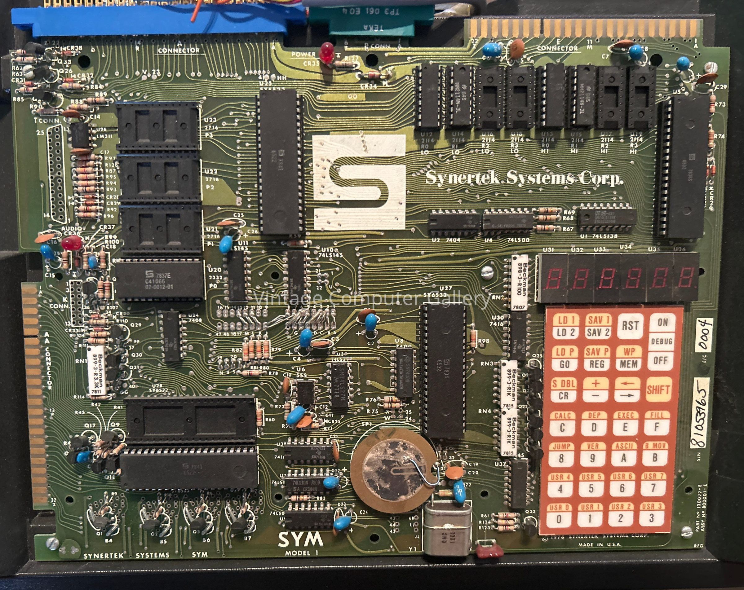 Synertek was one of the suppliers of the 6502 processor, and the SYM-1 was intended as a chip evaluation board for hardware developers that were interested in programming and interfacing a 6502. The SYM-1 was a single board computer. It had a hexadecimal display and a hex keypad for programs and data entry. It was originally called the VIM-1 until MOS Technology objected to the name. It was actually quite a copy of the MOS KIM 1 offering same functionalities plus some enhanced features and connection capabilities, including a true serial RS232 interface instead of a 20mA current loop in the KIM. It also shared same I/O connectors with another 6502 development system, the Rockwell AIM-65 A ROM chip contained the hexadecimal monitor (written by Manny Lemas, the co-founder of Microcomputer Associates) as well as standard I/O routines. Several programming language and utility software were later released. Among them: RAE-1 (Resident Assembler and Editor), FORTH and various flavors of BASIC, of which a powerful single precision version that needed the use of a video terminal. Like other evaluation boards of the times, the SYM-1 was delivered with a full set of documentations which covered all of the 6502 hardware and software capabilities. It was reported to us that the Sym card also came in a 6809 version that supported Motorola compatibility.