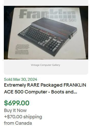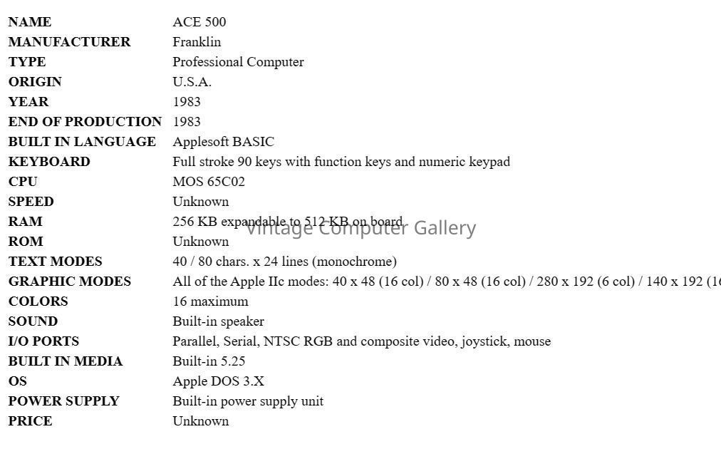 1983- The Franklin ACE 500 was a 100% Apple IIe and Apple IIc compatible computer with a built-in 5.25" disk drive and 256 KB of RAM. It looked pretty much like a black //c, featured all of the standard Apple ports and a better keyboard with a numeric keypad. It was also very similar to the Laser 128 in design and features. The ACE 500 was the last Apple II compatible Franklin manufactured. Its capabilities and abilities were identical to the Ace 2000 series. The Company was sued in 1982 by Apple for copyright and patent infringement and ceased making computers in August 1983.Acquisition