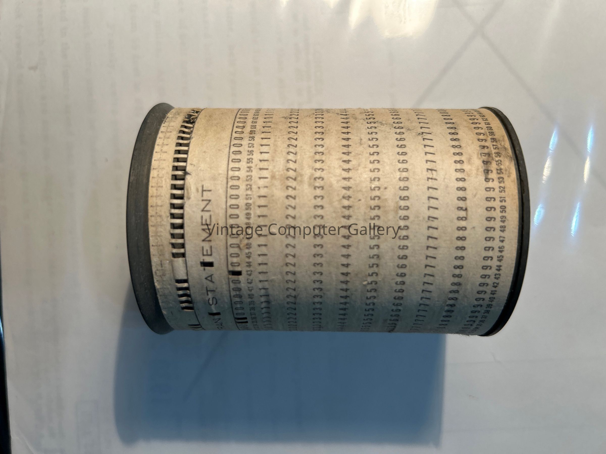 The Program Drum sat upright in the middle of the machine above the punching station. Programmers punched holes in a card and wrapped that card around the drum. This allowed automated behavior, such as left-padding numeric fields with zeros, to be programmed into the 0292.