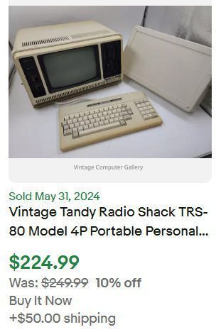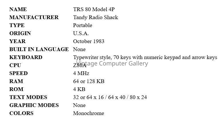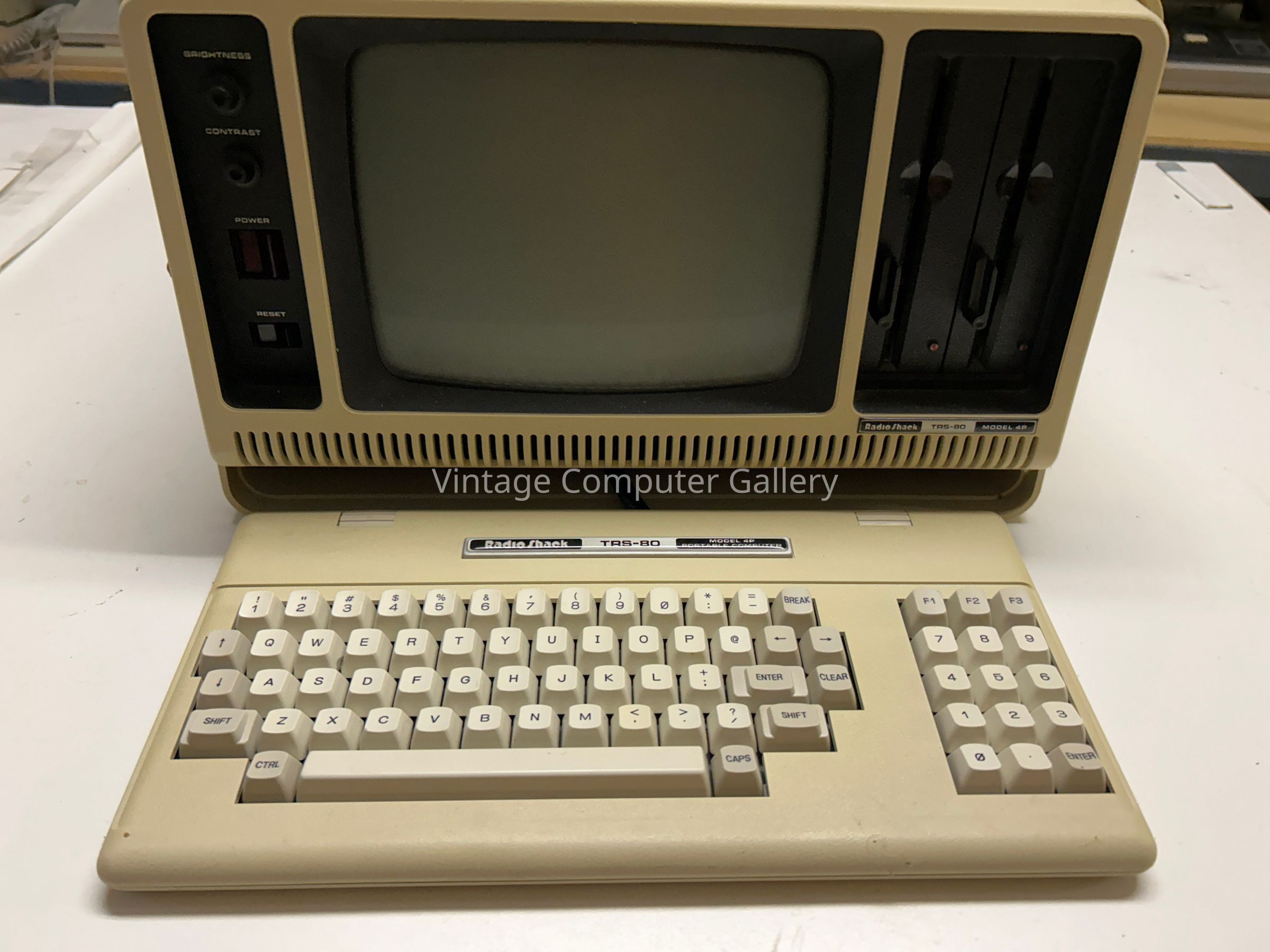 1983- The Model 4P was the transportable version of the Model 4. Apart from the case and display sizes, technical features were almost identical to the Model 4's. The dual half-sized floppy drives were still single-sided versions but the keyboard, which slided underneath the computer, was far better than the one of the desktop version. The external floppy drive connector was removed, as well as the Model 3 ROM, but a ROM image could be loaded from diskette to run Model 3 programs. An optional 300-baud modem could be also installed into the machine. Very late models had double-sided TEAC drives.Acquisition