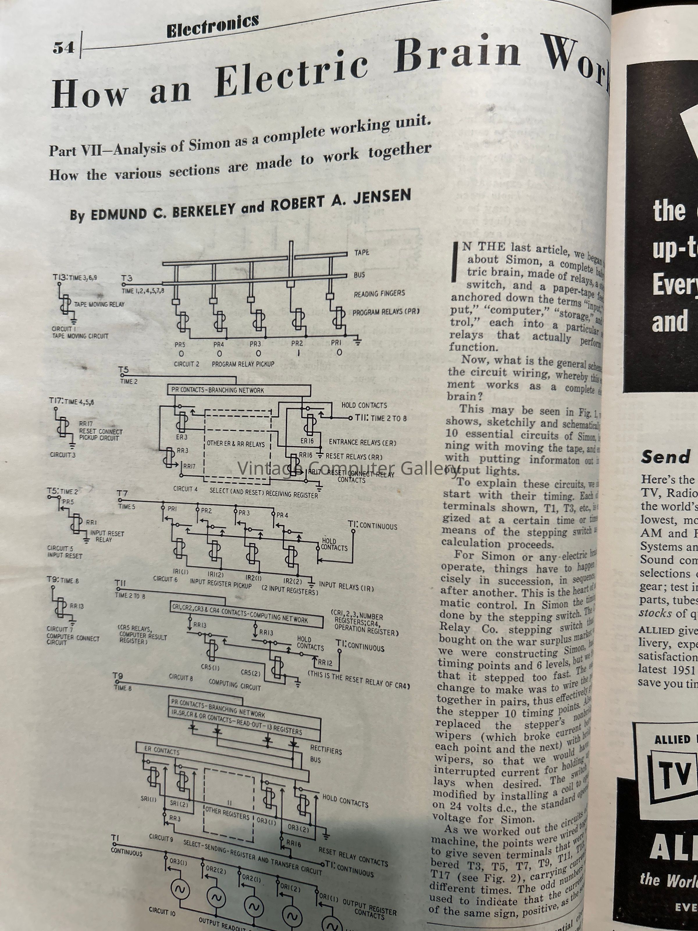 The article “How an Electric Brain Works” by Edmund Berkeley, published from Nov 1950 to May 1951 of Radio-Electronics, delves into the operations of Simon, a relay-based electromechanical computer. Berkeley’s piece is part of a series that explains the principles of digital computing to a general audience. Simon, despite its simplicity and limited memory, was designed to demonstrate the concept of a digital computer and could perform basic arithmetic operations.