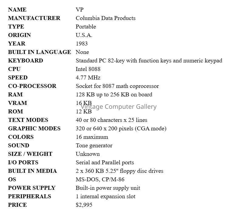 The Columbia VP was a Compaq Portable like IBM PC compatible. Besides, it was said that Compaq designed the electronic part of the VP. It was the last computer made by Columbia, the company which made the MPC, first true copy of the IBM-PC. Columbia built a very rugged but heavy case which supported a 9" monochrome monitor, larger than the Compaq. All other features were the same as the Compaq. When the system was launched, the main argument of Columbia was the large number of software bundled with it. Among them: MS-DOS, CP/M-86, Perfect series (Writer, Filer, Speller, Calc), MS-BASIC, Macro assembler, Home accountant and Space Commander game. It seems that several versions of the VP were built: 1600/1, 1600/4, 2110, 2220, VP-Plus, but we have no information about them.