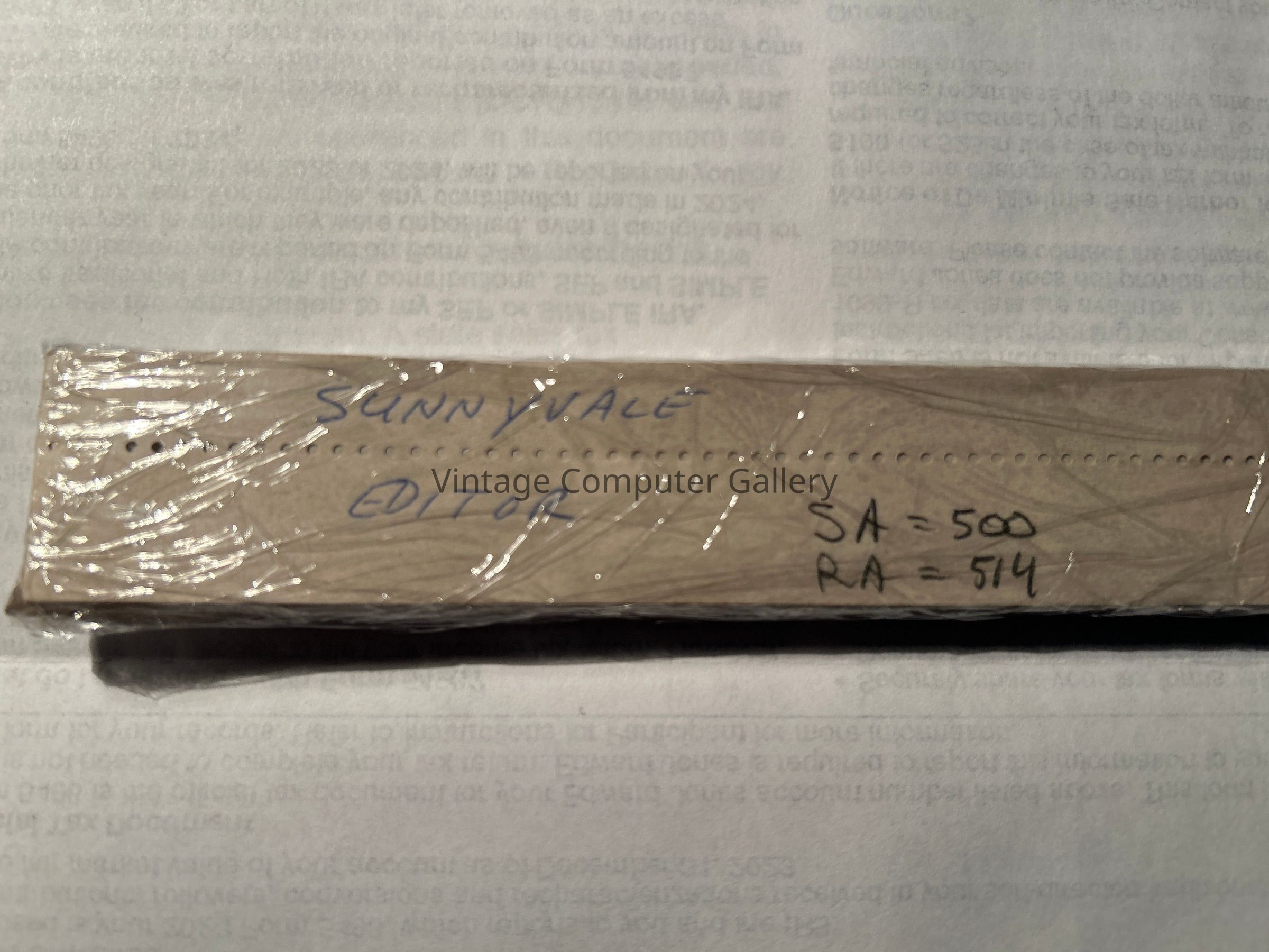 The "Sunnyvale Editor" is a vintage paper tape software tool used for text editing on early computer systems. It was designed to run on systems like the DEC PDP-11, which utilized paper tape as a storage medium. The editor allowed users to create, modify, and manage text files, making it an essential tool for programming and documentation in the early days of computing.Acquisition