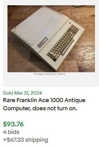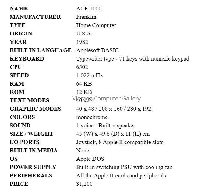 1982- The Franklin ACE 1000 was launched in 1983. It was the successor of the ACE 100, released in 1981. The ACE 1000 had 48 KB RAM and allowed for a 16 KB Language card. It also supported lower-case letters, had a numeric keypad, and a larger case. From the factory, the Ace-1000 did not support colours but there was a colour chip that could be added by the dealer for $50 (this dealer add-on was an attempt to protect themselves legally against lawsuits from Apple). It was fully compatible with the Apple II and could use the same programs and cards. Unlike the Apple II, the Franklin didn't have tape recorder In/Out jacks but its power supply had an integrated cooling fan. The makers of this computer would be sued in 1984 for violation of certain Apple trademarks, namely, the operating system. Apple would win the lawsuit, and Franklin would be forced out of the computer business.Acquisition