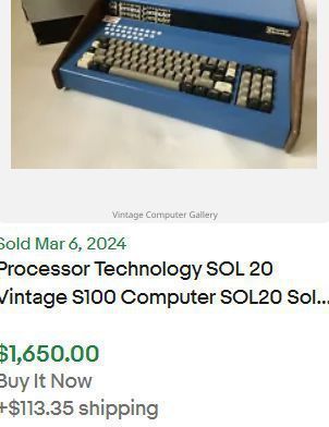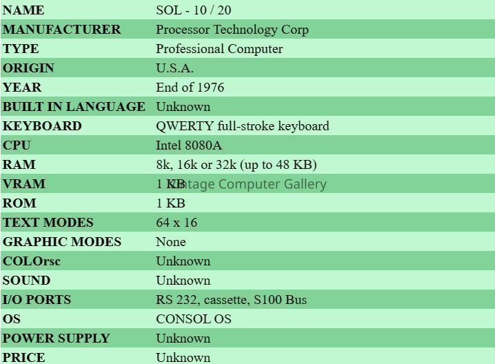 The Sol Computer was developed by Bob Marsh, Lee Felsenstein and Gordon French. Bob founded his company, Processor Technology, in April 1975 making 4K RAM memory boards for the Altair (cause MITS couldn't make a working memory board) In June 1975, Bob and Les Solomon (technical editor of Popular Electronics) dreamed up the Sol-20 computer, Bob had a bunch of cheap walnut that he originally intended to use in a digital clock, he didn't want it to go to waste and used it in the Sol-20 (see picture). About 10,000 of them were produced, some as kits, some as pre-builts. Based on the Intel 8080 microprocessor, this machine occupies a special niche in computer history for technical and esthetic reasons. It was one of the earliest to include a keyboard interface and support circuitry for full implementation of every 8080 function. It was a pioneer towards modern video output boards by having a design that actually put up alphanumeric characters on the screen, using a form of distributed processing that didn't lean on the CPU for all processing. There were several models of the SOL-20 system : - The SOL System I ($1649 in kit or $2129 assembled), with SOL Operating System, 8 KB RAM, a 12" TV/Monitor, and a cassette recorder with BASIC software tape. - The SOL System II ($1883 in kit or $2283 assembled), is a SOL System I with 16 KB.