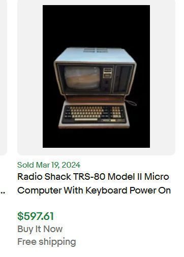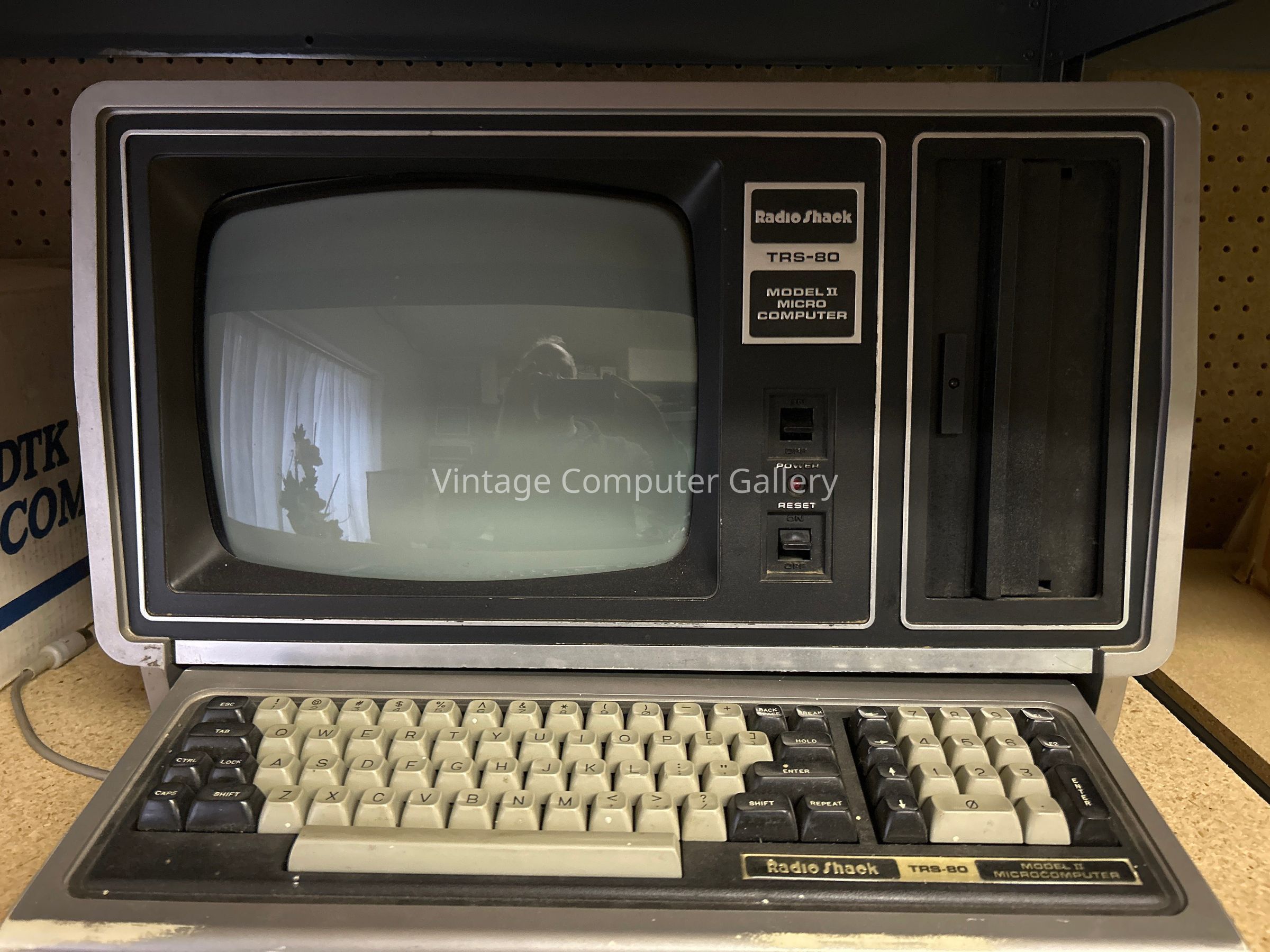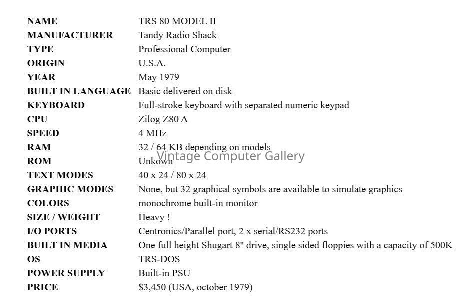 1979- The TRS-80 model II, is the obscure brother of the TRS-80 family. Many internet pages deal with the models 1,3 and 4 but omit the model 2... This is maybe because the TRS-80 Model 2 was intended to be a business computer for use in offices and labs. Thus it is equiped with a full height Shugart 8'' drive with a capacity of 500k which is a lot compared to the 87k offered by the TRS-80 Model 1 system disk. It is also possible to connect up to 4 floppy disk units, so you could have 2MB disk space online ! It runs under TRSDOS, but can also achieve CP/M compatibility. Options for the machine included a hard disk controller, an arcnet network card, a graphics card and a 6 MHz 68000 board set with extra memory (up to 512K) so it could run XENIX.Acquisition