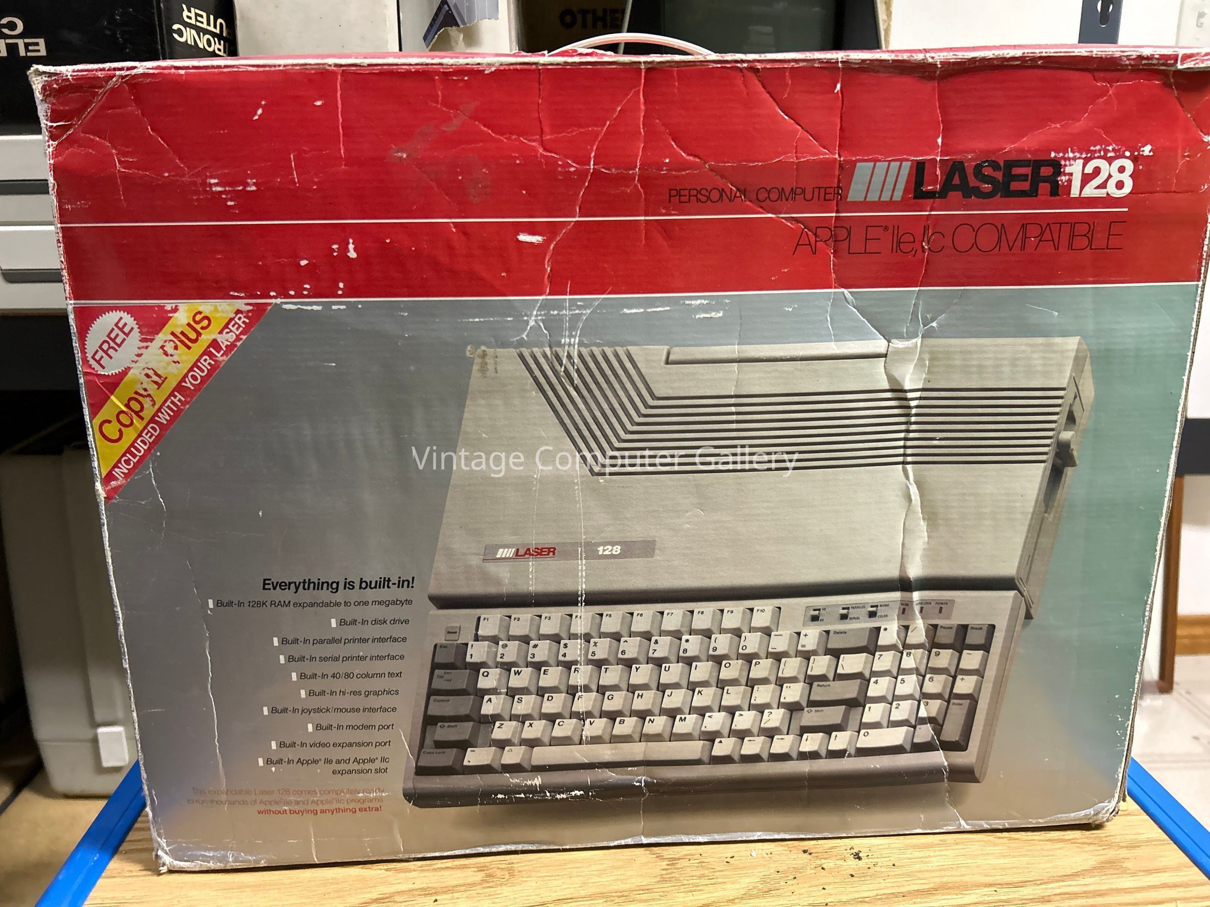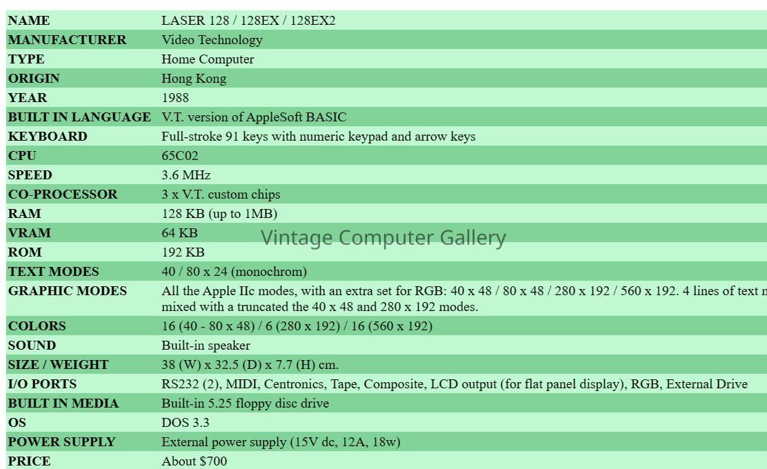 1988- The Laser 128 EX is the successor of the Laser 3000. Like the 3000, it is fully compatible with the Apple II computer, but has enhanced features. Video Technology designed its own Apple II compatible ROM (Apple lost a lawsuit challenging it), this ROM holds an Applesoft compatible version of the BASIC. The "Open Apple" and "Closed Apple" keys have been replaced with "Open Triangle" and "Closed Triangle" keys. The 128EX/2's Video Display Generator chip also provided both analog RGB video (for connecting an Apple IIGS, Amiga, or Atari ST monitor) and digital RGB video (for connecting a CGA monitor). In RGB mode, the Video Display Generator (VDG) chip generates a text character set identical to an IBM PC (with the addition of the Open and Closed Triangle characters) The drive and the external daisy-chainable SmartPort floppy drive is driven by Video Technologies custom "Universal Disk Controller" (UDC) disk array chip. The SmartPort supports Apple IIe/IIc UniDisks (3.5" and 5.25" models), Macintosh 3.5" drives (the ones without the buttons), Apple IIGS daisy-chainable 3.5" drives and Apple 5.25" disks. It is also designed to support the Chinook CT-series 20 MB to 100 MB SmartPort hard drives. The SmartPort can support two 800K 3.5" drives, two 140K 5.25" drives, and one 100 MB CT100 hard drive simultaneously daisy-chained to each other.