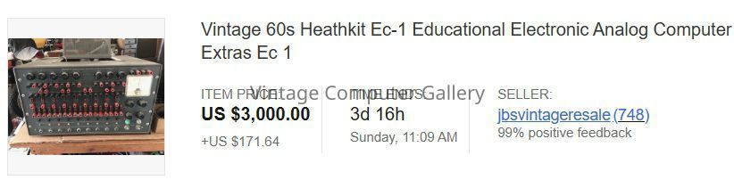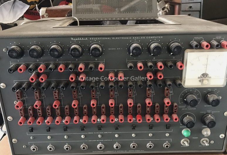 From 1950 to 1965, electronic analogue vacuum-tube computers were used to design, test and run civilian and military equipment like aircraft, ships or rockets. The first systems were very expensive. However, components cost (especially vacuum tubes) was steadily decreasing. In 1960, Heath Company launched the HealthKit EC-1, the first analogue computer (almost) anyone could afford. It was sold in kit or pre-assembled forms and was quickly and widely used in industry and universities. Unlike our modern binary computers which accept only two values as entry (0 or 1), an analogue computer represents input and output data's in voltage levels. So, any positive or negative value could be read directly from the built-in meter. An external oscilloscope could be also used as a display device, as well as a grapher for printed results. In spite of its apparent simplicity, the EC-1 could solve a multitude of complex mechanical and mathematical problems thanks to nine DC operational amplifiers, three initial condition power supplies, potentiometers, relay contacts, high precision resistors and capacitors, and a built-in oscillator for repetitive operation (from 0.1 to 15 operations per second). The computer was described by HealthKit as "Excellent teaching aid for a course in computer electronics - Vividly illustrates the electronic analogies to mathematical problems - Handles problems as complex as fluid flow, damped harmonic motion, and flight of a projectile in a viscous medium. Computer problems could be 'programmed' by inserting several patch cords into the problem-board sockets and thus linking in chain several built-in components together.