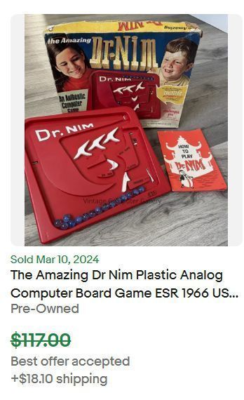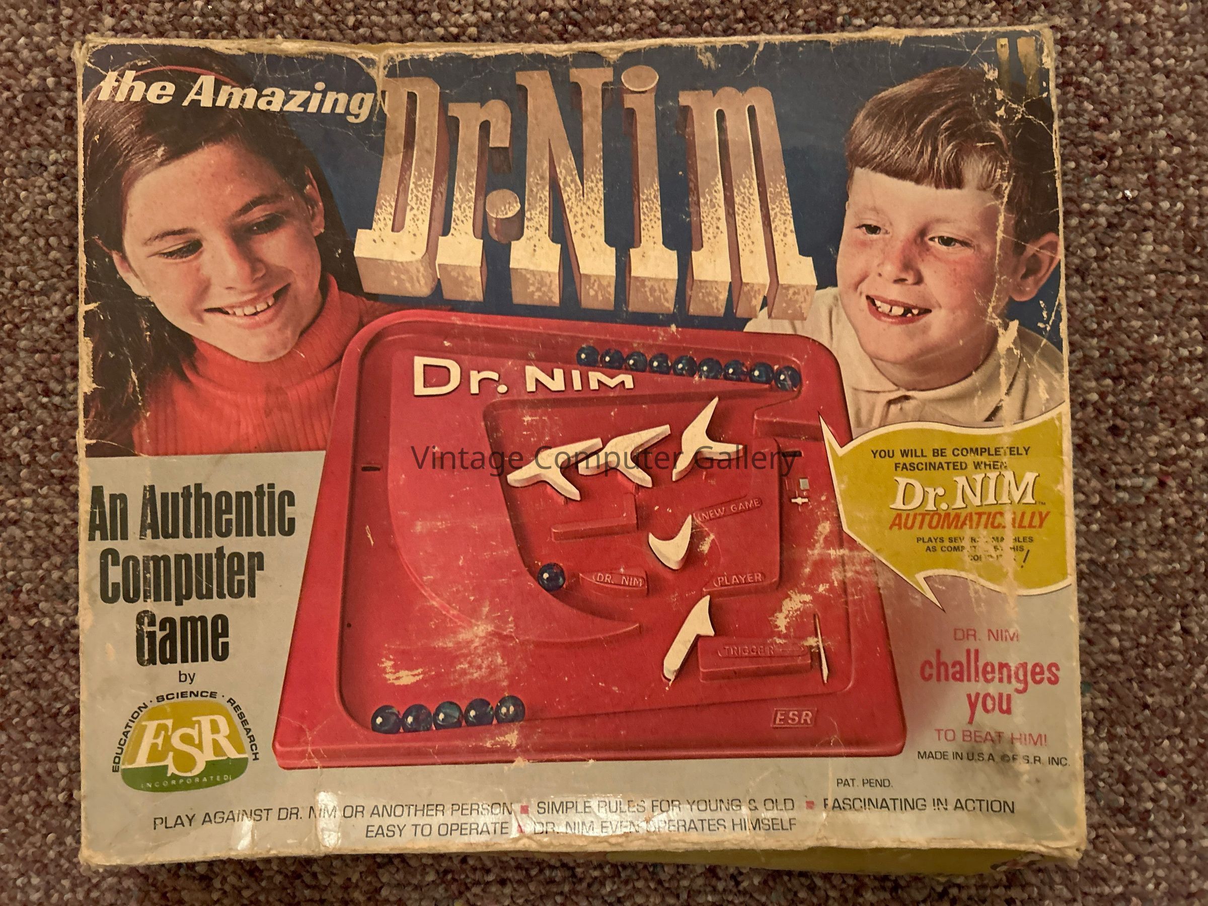 1961- Dr. NIM was a game manufactured by E.S.R., Inc. in the mid-1960s. It consisted of a plastic computer and a set of marbles. The machine would play a person at the game of Nim. The machine was powered by the action of the marbles falling through the machine. A classic game played commonly with 15 sticks. Two players have the choice of taking one, two, or three sticks from the pile at each turn. The player who gets the last stick loses. Dr. Nim plays the same game, only with marbles. Either player can start, and Dr. Nim rarely loses! Another example of computer programming logic realized in plastic. Dr. Nim is also capable of playing a number of variations on the game, and is equally difficult to beat in all of them.