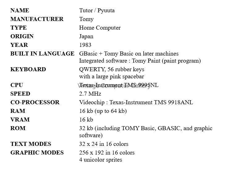 1983- This computer was partially compatible with the Texas Instuments TI 99/4A. It had almost the same characteristics, except its main CPU (TMS 9995 instead of the TMS 9900 for the TI 99/4A). The two languages (GBASIC and Tomy Basic) were only available in UK and US computers. The Japanese computers didn't have the Tomy Basic (a TI-like Basic), but a "nihongo basic" using japanese characters and words, e.g. "kake" meant "print", "moshi-naraba" meant "if-then". This computer, known under the name Pyuuta in Japan had no really success outside Japan. It was followed by the Pyuuta Mark 2 and a game console called Pyuuta Jr one year later.Acquisition