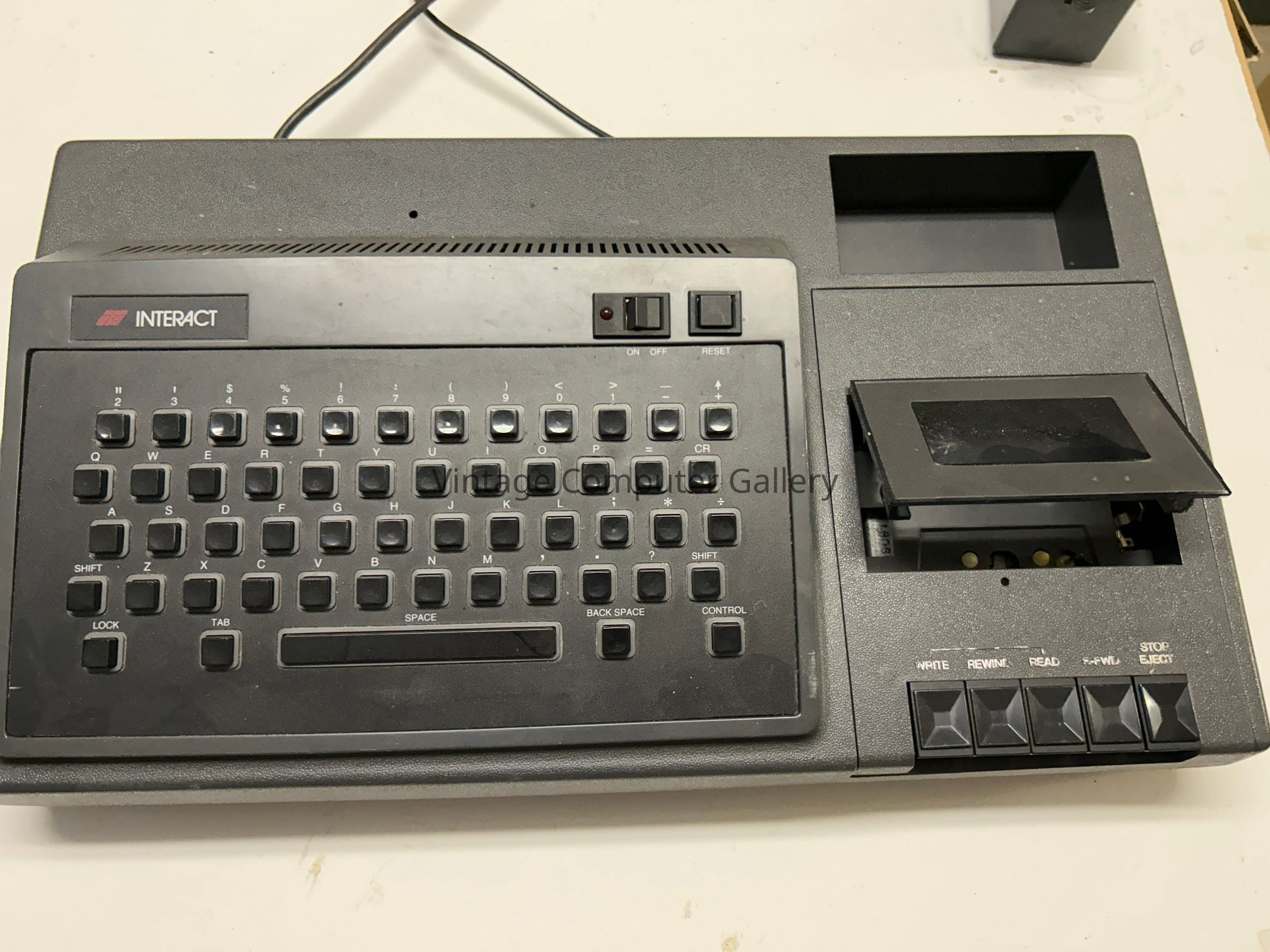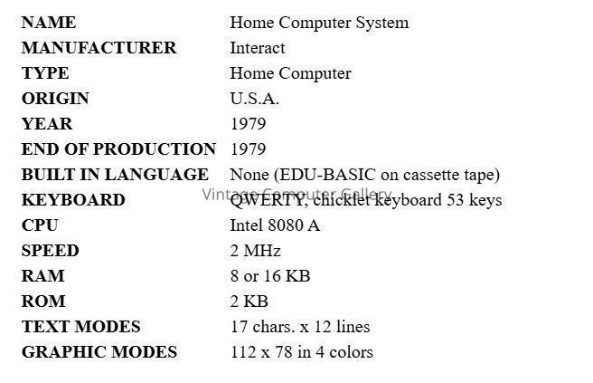 The Interact computer had a very short life in USA. It had only just got in production when the Interact Co. of Ann Arbor MI, went bankrupt. Several thousand machines were produced though. Some of them were sold by Protecto Enterprizes of Barrington, IL, the liquidator, but the main part was sold by MicroVideo, also of Ann Arbor. Protecto bought lots of back-of-the-magazine ads for years, always printed with "WE LOVE OUR CUSTOMERS". The Interact shipped with 2 joysticks, a built-in tape recorder, a TV RF modulator and 2 KB of ROM. Everything, including BASIC, must be loaded from tape. A little trivia: The tape unit did include an erase head, but it was not connected! Tapes had to be erased on a regular cassette recorder before being reused. Another surprising feature is that the "1" key is after the "0" key at the far right of the keyboard. Thus the row is starting from 2 and finishing by 1... See explanation in the "Read more" page. MicroVideo supported the machine for two years, 1979-80, making some hardware expansions (32K RAM card and stringy floppy drive), replacing the original minimalist EDU-BASIC language with a Microsoft 8K graphic version, and even publishing 3 issues of 'Interaction', a newsletter of the Detroit Interact Group. The Interact computer finally vanished from the US market in late 1980. However, a French company bought the rights of the machine and started to sell the Interact under Victor Lambda name in French market.