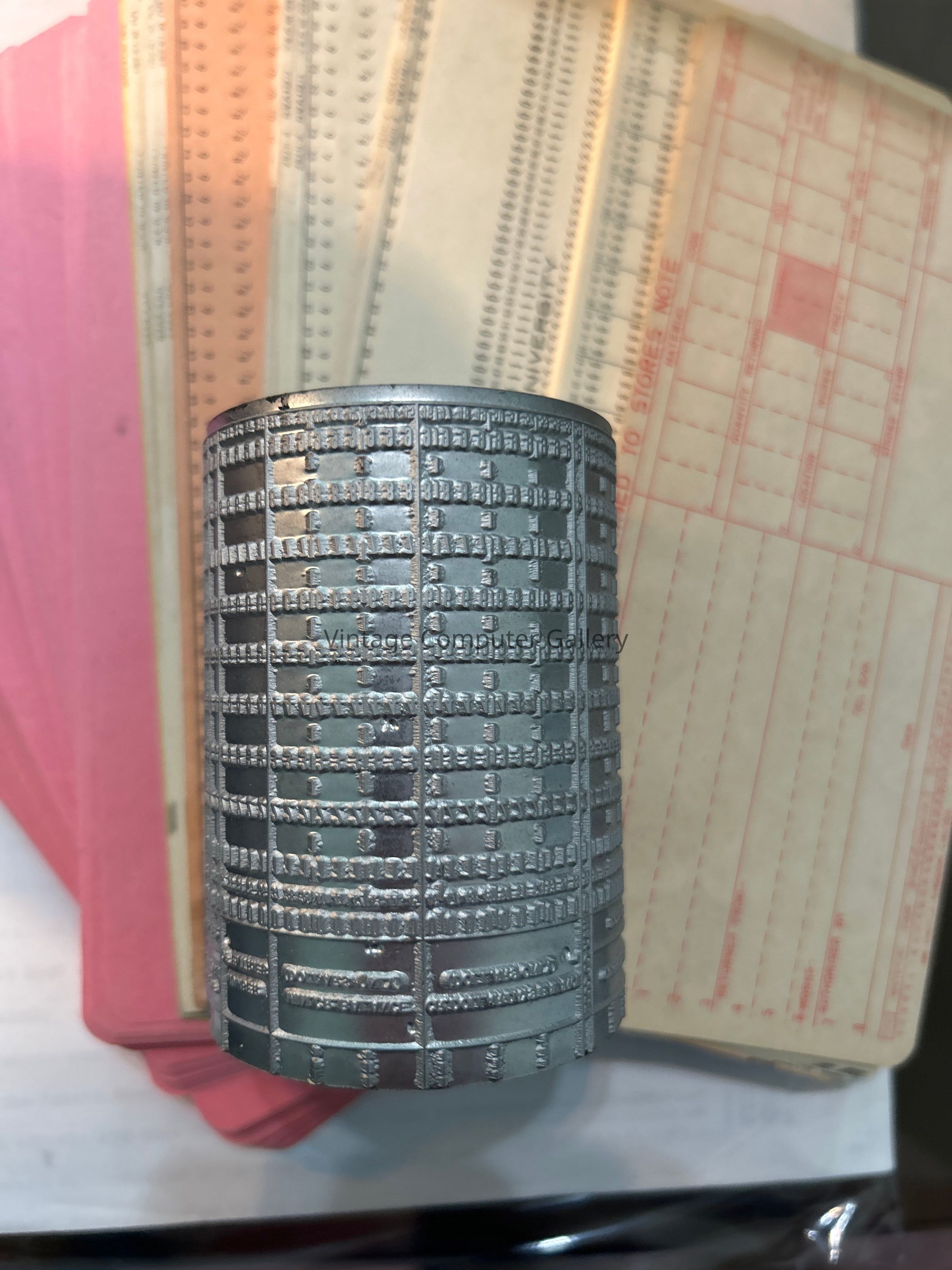 The printing plate, often the size of an IBM card, was formed into a cylinder. It contained the layout for a specific type of punched card (e.g., 80-column format). These plates were used in rotary presses to print the cards.