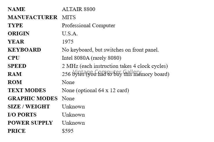 This computer was one of the first "home" computers ever made, it was sold as a kit, but for additional money, you could buy one fully assembled. It had no keyboard, the "program" had to be entered with the switches located on the front panel of the "computer", and as it didn't have video output (yet), the result was displayed via LEDs. Another computer which had almost the same characteristics was launched by IMSAI and was called IMSAI 8080 (see both in the "Emulators" section). The ALTAIR 8800 had one input port, also called the "Sense Switches" (I/O address 255) which was the left hand 8 address switches. Address 255 was also used on the IMSAI. The IMSAI front panel differed from the Altair in that you could also output to port 255 to a displayed LED buffer above the sense switches - a feature the Altair did not have (it only had input). The Altair sense switch were used during boot into Altair DOS to specify the termi nal port to the DOS. MITS made several peripherals and cards for this computer, namely, a video card, a serial card to connect a terminal, a RAM expansion card and a 8" floppy drive that used hard sectored floppies and stored 300 KB. Several models were launched, they had the same characteristics except the CPU (8080 and later 8080A). Believe it or not, the name "Altair" comes from Star Trek! The young daughter of the 'Popular Electronics' magazine editor gave it the name of the destination planet of the Enterprise from the episode she was watching.Acquisition