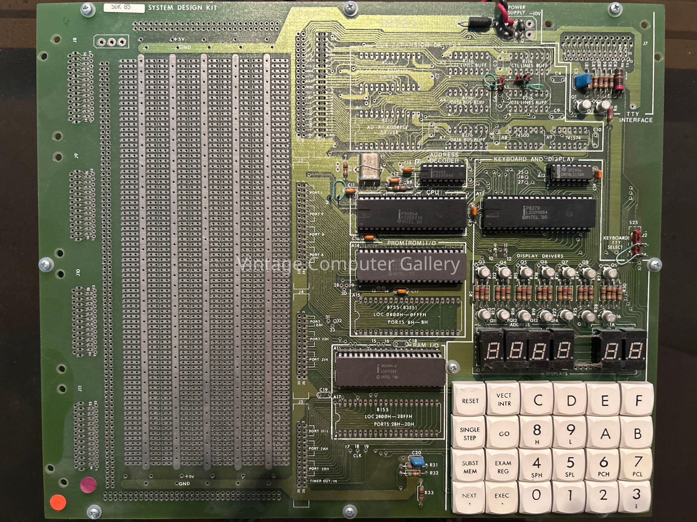 Each time Intel launched a new microprocessor, they provided simultaneously a System Development Kit (SDK) allowing computer company ingineers as well as university students to introduce them to the new processor concepts and features. The SDK-85 was a complete 8085A (5 for 'first 5 Volt microprocessor') microcomputer system on a single board including ROM and RAM memory, a 24 key hexadecimal keyboard, a 6 digit LED display, I/O connections and an expansion area allowing memory and I/O expansions as well as hardware experiments. A 2 KB monitor software provided the same commands as the SDK-86 board. User could enter and read program results through either the buit-in keyboard/display or using a serial Teletype through the built-in serial TTY interface. A 38 lines parallel interface was also available. A large set of manuals were delivered with the board: MCS-85 (processor) and SDK-85 (board) user manuals, 8085 Assembly Language Programming Manual, full circuit schematics of the PCB, a full dump of the ROM monitor program, programming examples and application notes.